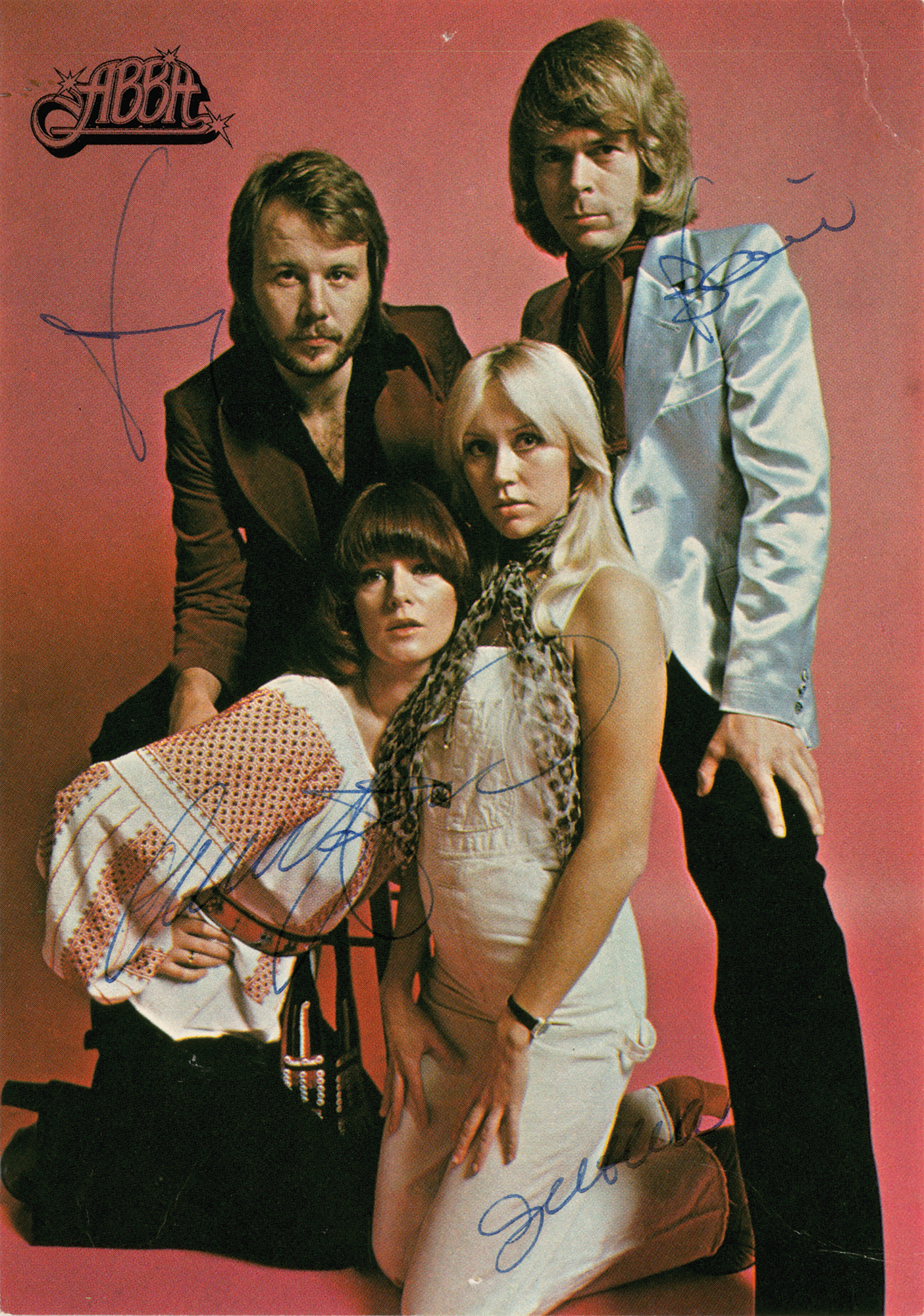 Classic color 4 x 6 cardstock promo photo of ABBA, signed in blue ballpoint by Agnetha Faltskog, Bjorn Ulvaeus, Benny Andersson, and Anni-Frid Lyngstad. In fine condition, with some edge creasing, and a tack hole to the top edge.