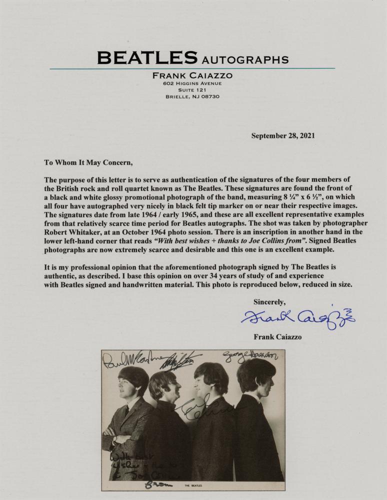 Vintage circa 1965 glossy 8.5 x 6.5 promo photo of the Beatles taken by Bob Whitaker, nicely signed in black felt tip by the entire group: "John Lennon," "Paul McCartney," "George Harrison," and "Ringo Starr," and inscribed in the lower left in another hand, "With best wishes & thanks to Joe Collins from," with "The Beatles" printed in the lower border. In fine condition, with trimmed edges, pin holes at the corners, and a hint of light scuffing. Accompanied by a letter of authenticity from noted Beatles expert Frank Caiazzo, noting: "The signatures date from late 1964/early 1965, and these are all excellent representative examples from that relatively scarce time period for Beatles autographs."