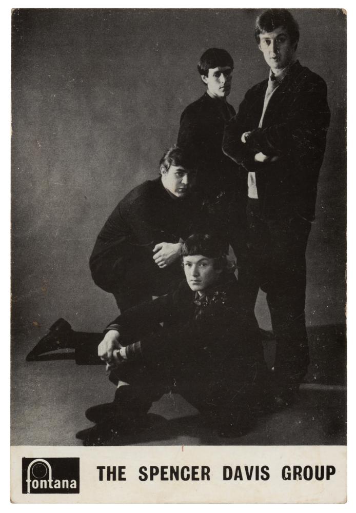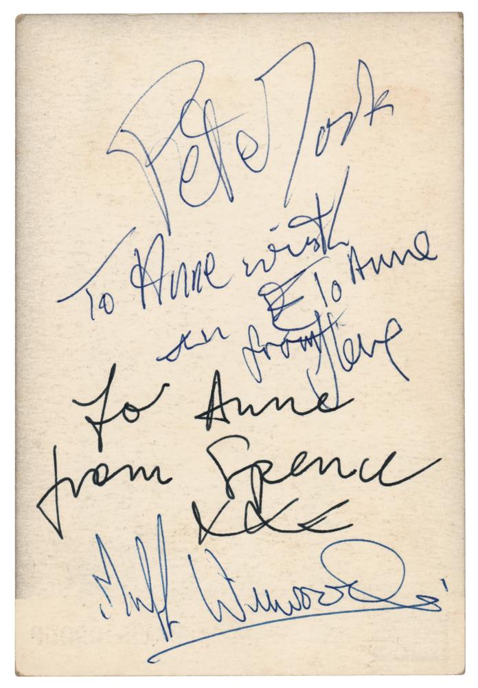 Vintage circa 1960s Fontana Records promo card featuring the Spencer Davis Group, signed and inscribed on the reverse in ink by Spencer Davis, Pete York, Steve Winwood, and Muff Winwood, with most adding inscriptions to "Anne." In fine condition, with light surface impressions on the photo side from the signatures on the back. Accompanied by a certificate of authenticity from Tracks.