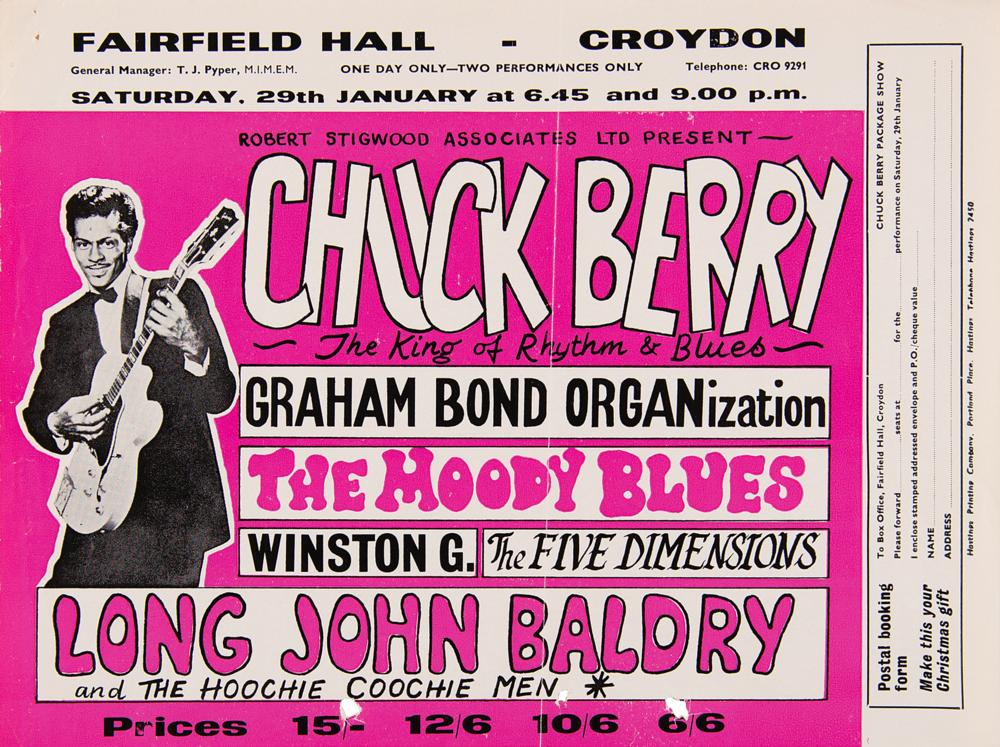 Scarce original color 10 x 7.5 handbill for a concert headlined by Chuck Berry, “The King of Rhythm & Blues,” at the Fairfield Halls in Croydon, England on January 29, 1965, which also lists supporting acts The Moody Blues, Graham Bond Organization, Winston G., The Five Dimensions, and Long John Baldry and the Hoochie Coochie Men. The right side bears the postal booking form. In very good to fine condition, with a vertical fold, and a few small holes along the bottom. Accompanied by a certificate of authenticity from Tracks.