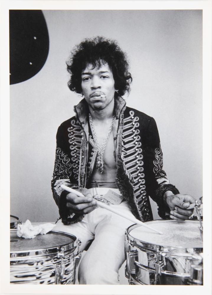Modern glossy 5.5 x 7.5 photo of Jimi Hendrix taken by Jim Marshall, which shows the Experience guitarist smoking and playing the drums during a sound check at the Monterey Pop Festival in June 1967. The reverse bears a Jim Marshall copyright stamp. In very fine condition. Accompanied by a certificate of authenticity from Tracks.
