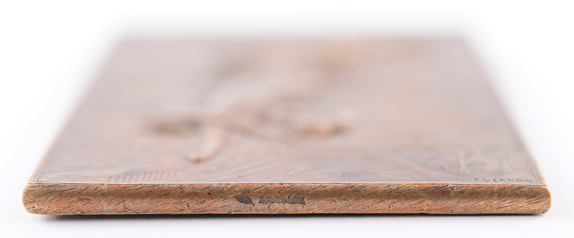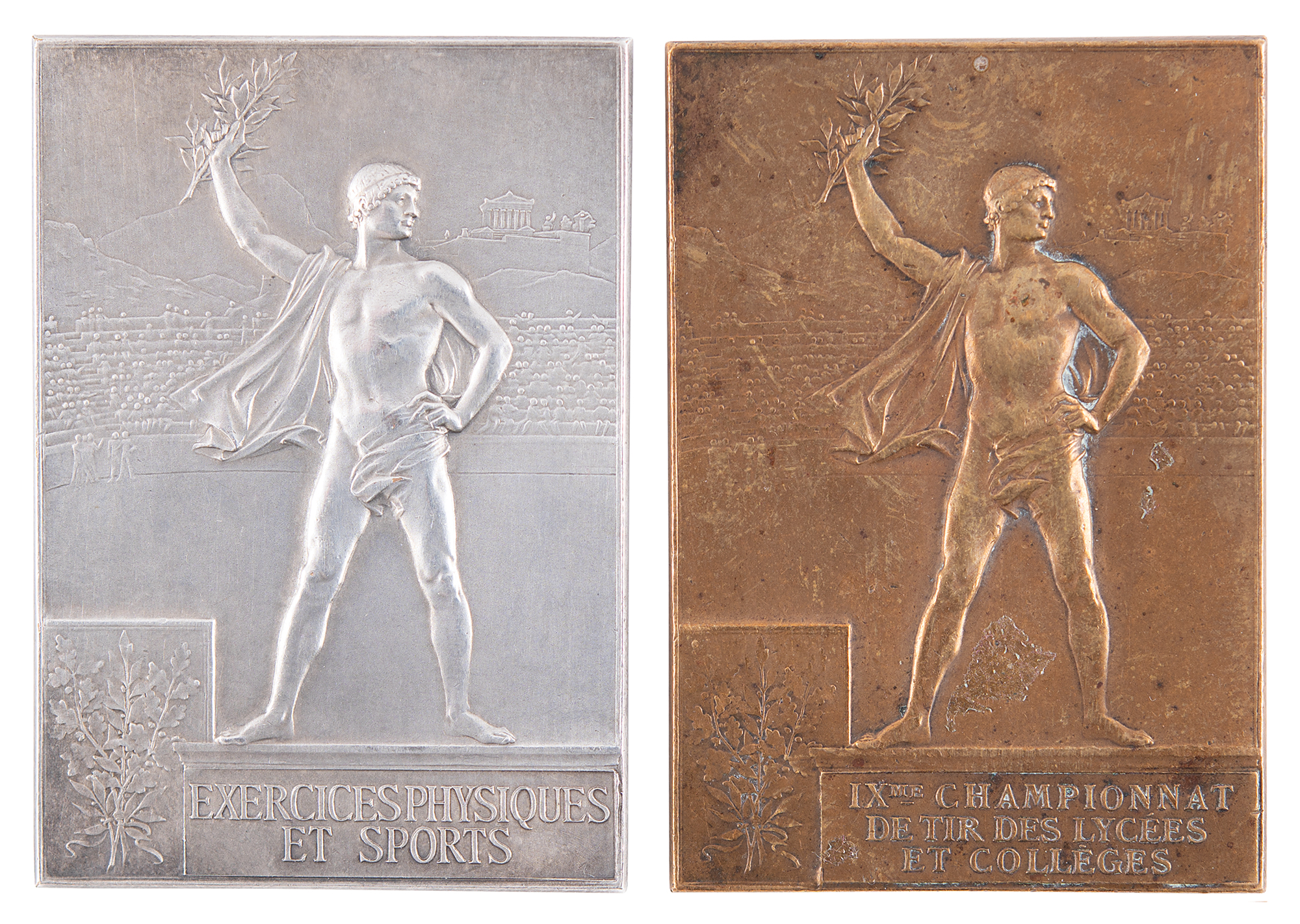 A bronze winner’s medal issued for a high school and college shooting competition hosted alongside the Paris 1900 Olympics, 42 mm x 60 mm, 59 gm, by Frederic Vernon, Paris. The front, inscribed “Republique Francaise, Exposition Universelle, Paris 1900,” features a winged goddess scattering laurels over the grounds of the Exposition, and the reverse identifies the sport as shooting, “IXme Championnat de Tir des Lycées et Collèges [9th High School and College Shooting Championship]” and depicts a victorious athlete upon a podium with a stadium and the Acropolis in the background. Stamped “Bronze” on an edge.