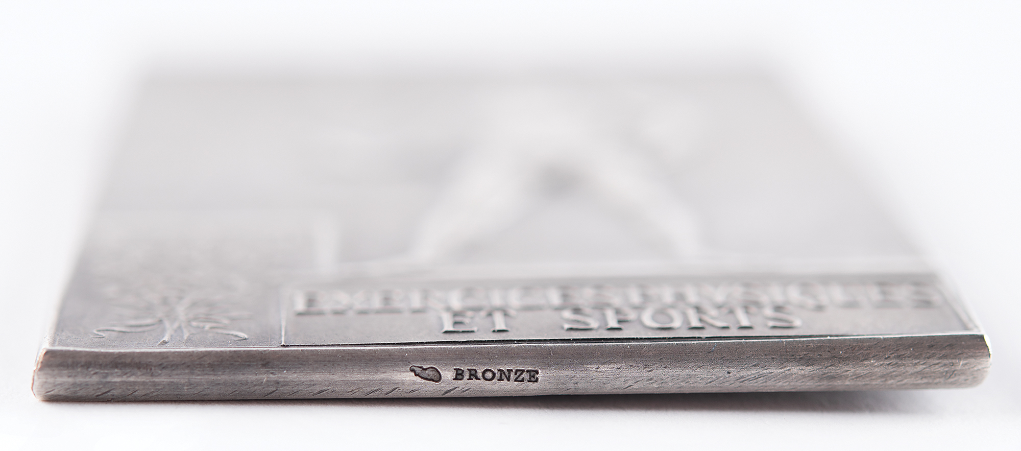 A silvered bronze winner's medal for physical exercise and sports, 42 mm x 60 mm, 57 gm, by Frederic Vernon, Paris. The front, inscribed "Republique Francaise, Exposition Universelle, Paris 1900," features a winged goddess scattering laurels over the grounds of the Exposition, and the reverse identifies the sport as "Exercices Physiques et Sports," and depicts a victorious athlete upon a podium. Stamped "Bronze" on the edge.
