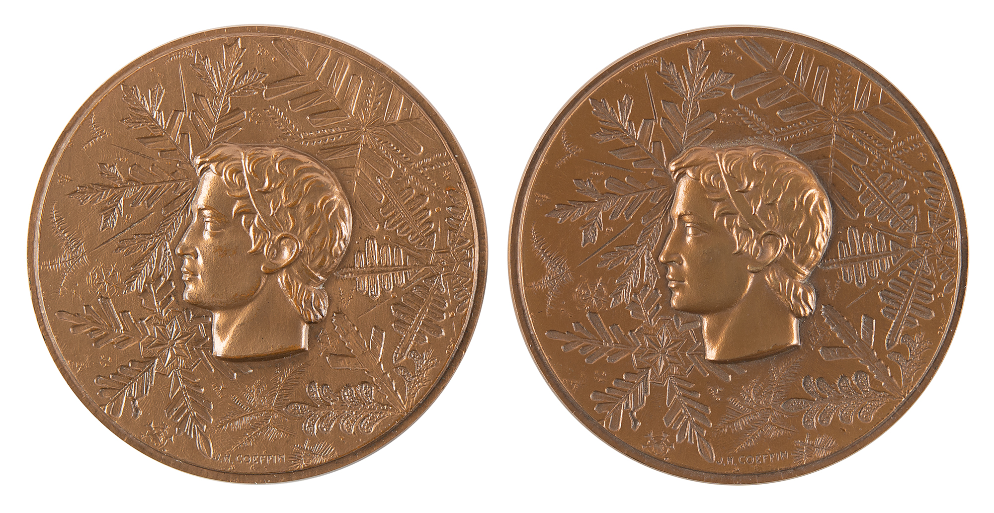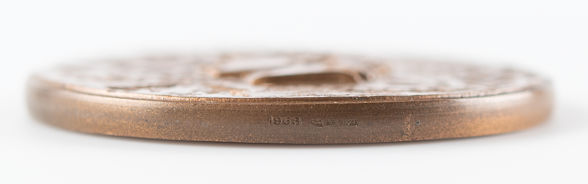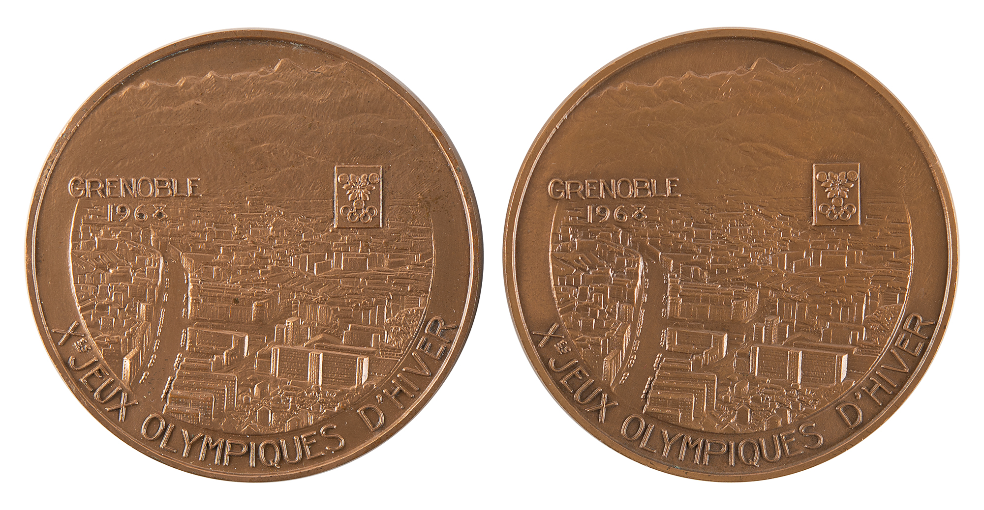 Two participation medals issued for the Grenoble 1968 Winter Olympics. Both bronze, 68 mm, 158 gm, by J. M. Coeffin. The fronts depict a Greek athlete wearing a headband superimposed against a background of snowflakes; and the reverse sides bear the Grenoble Games emblem and a city view with the Belledonne mountain range in the background, with raised text along the bottom, “X Jeux Olympiques D’Hiver.” One medal includes its original paper case.
