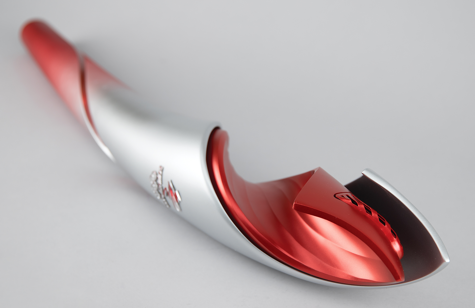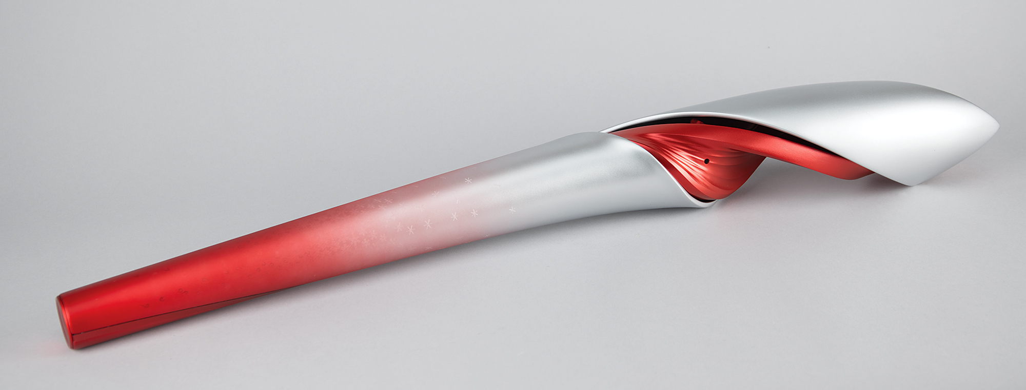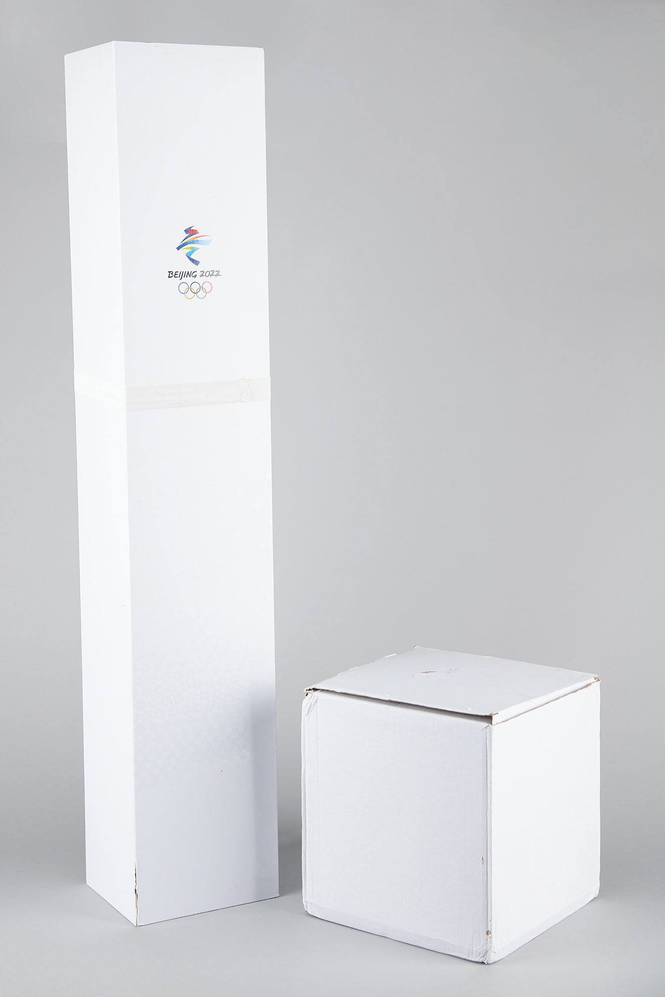 Official 2022 Beijing Winter Olympics torch, constructed of a resin-coated carbon fiber composite, measuring 33" in length and 4" at its widest point. Manufactured by Sinopec Shanghai Petrochemical Company and designed by Li Jianye and his team, the torch was inspired by the natural flowing beauty of plants and flowers, a theme that meshed with Beijing’s green approach to the torch’s materials and combustion fuel—carbon fiber composite, a new material made of petroleum products, and hydrogen gas, a special fuel that proved both smoke-free and environmental-friendly. The flora-like spiral construction resulted in a floating ribbon look, and its beautiful replication of movement led to it being given the name ‘Flying’ [Fei Yang]. The torch utilizes an open design with a stunning red and silver color scheme, a metaphor for ice and fire, meant to symbolize how the torch will bring 'light and warmth to this world of ice and snow’—this color combination, and even the torch’s design, relates to its 2008 predecessor and ceremonial cauldron. ‘Flying’ is exceptionally light yet durable, having been created with high-tech 3D knitting technology to form a body seven to nine times harder than steel. The upper portion of the body bears the Beijing 2022 emblem, the lower portion features 1,268 laser-engraved convex clouds and low-relief snowflakes patterns, and the torch’s centralized swirling red line represents the winding Great Wall, the Olympic ski slopes, and ‘humanity's relentless quest for light, peace, and excellence.’ Includes the original presentation case, which bears light marks and some noticeable wear to edges, its commemorative certificate, and its beautifully made display base, the underside of which is numbered “9750.” The base includes its matching certificate of authenticity and shipping box.