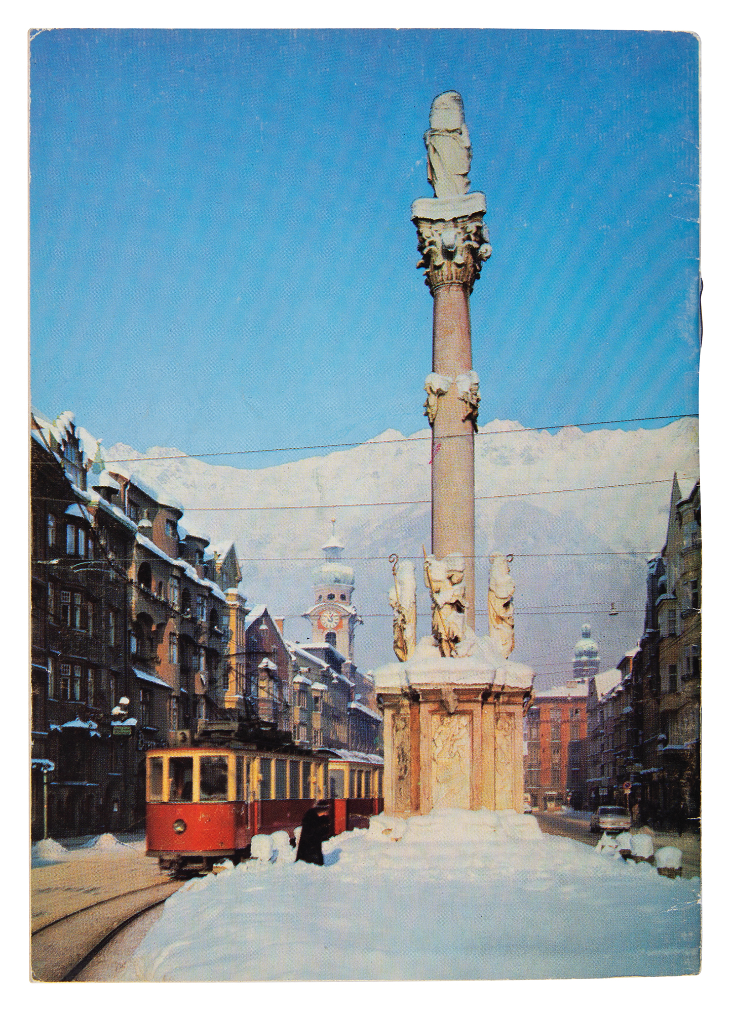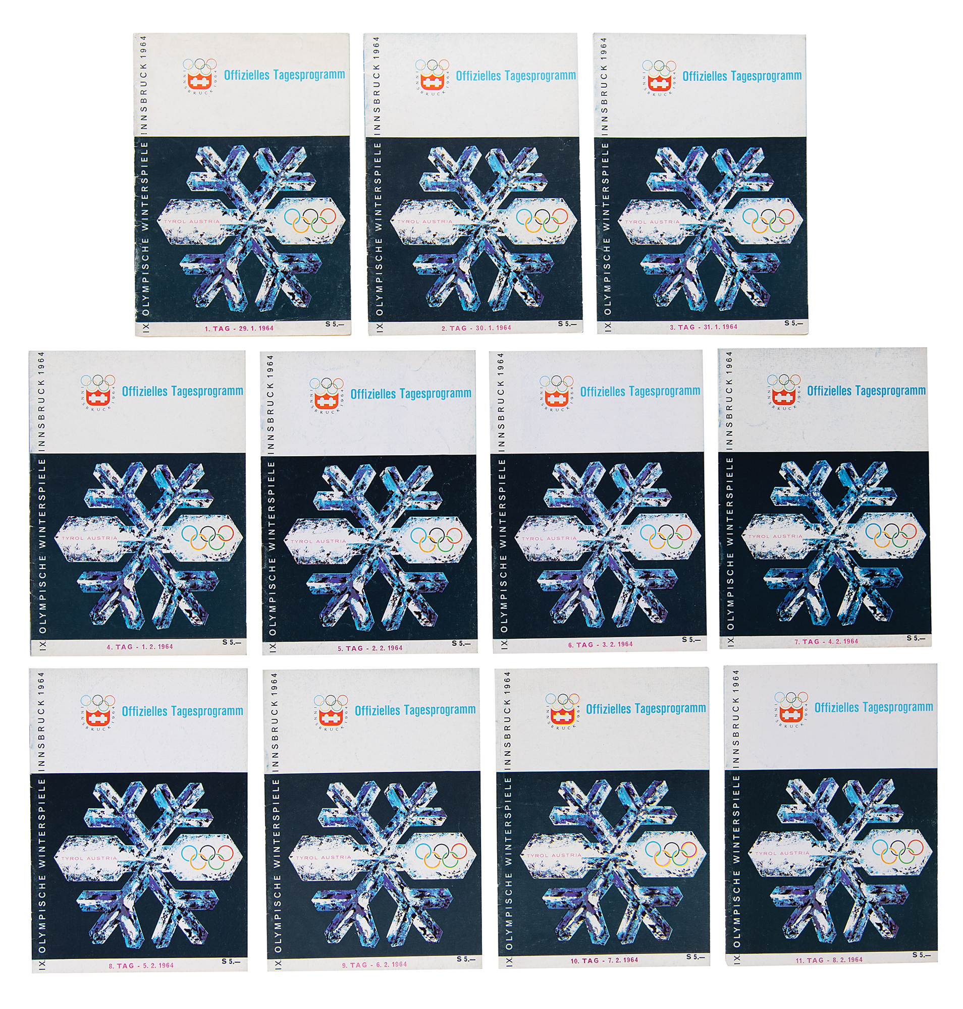 Collection of 11 official German-language daily programs from the Innsbruck 1964 Winter Olympics, each 4.75 x 6.75, with the front cover featuring a large snowflake design with Olympics rings and text “Tyrol, Austria,” and the back cover bearing a photo image of Innsbruck’s St. Anne's Column in front of the Nordkette mountain chain. The programs, which are dated January 29-31 and February 1-8, contain event schedules, scoring sheets, and rosters for nations competing that day, with each program containing rosters for teams partaking in the ice hockey tournament. The last two programs contain lists for medal winners, and a few programs contain ink and pencil notations. In overall fine condition, with some wear to spines.
