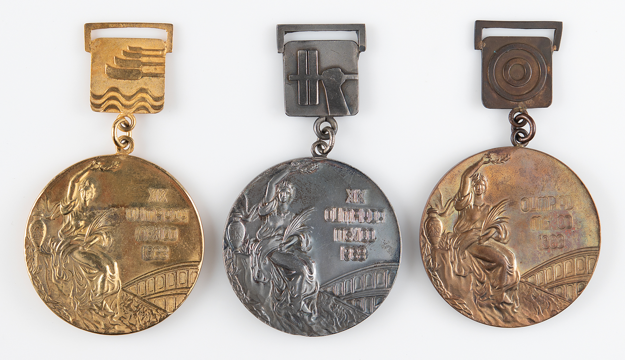 Rare and magnificent complete set of unawarded gold, silver, and bronze winner's medals from the Mexico City 1968 Summer Olympics. Based on the classic design by Giuseppe Cassioli, the medals measure 60 mm in diameter and weigh 125 gm (gilt silver), 124 gm (silver), and 100 gm (bronze). The front of each medal, inscribed, "XIX Olimpiada Mexico 1968," features a 'Seated Victory' with the Colosseum in the background; the reverse of each medal depicts a victorious athlete with a palm branch being carried by several jubilant athletes. Small plaques attached to the top of the medals feature pictograms representing three different events: rowing, shooting, and weightlifting. The medals are housed in a handsome velvet-lined black leather presentation box, with white text inside the lid: "XIX Olimpiada, Mexico, 1968." Also includes a set of winner's pins in gold, silver, and bronze, featuring miniature duplicates of the larger Mexico City winner’s medals, suspended from small upper plaques featuring pictograms for the rowing event. A fabulous, complete presentation of winner's medals from the historic 1968 Summer Olympic Games in Mexico City.