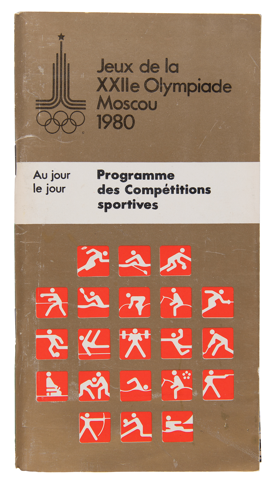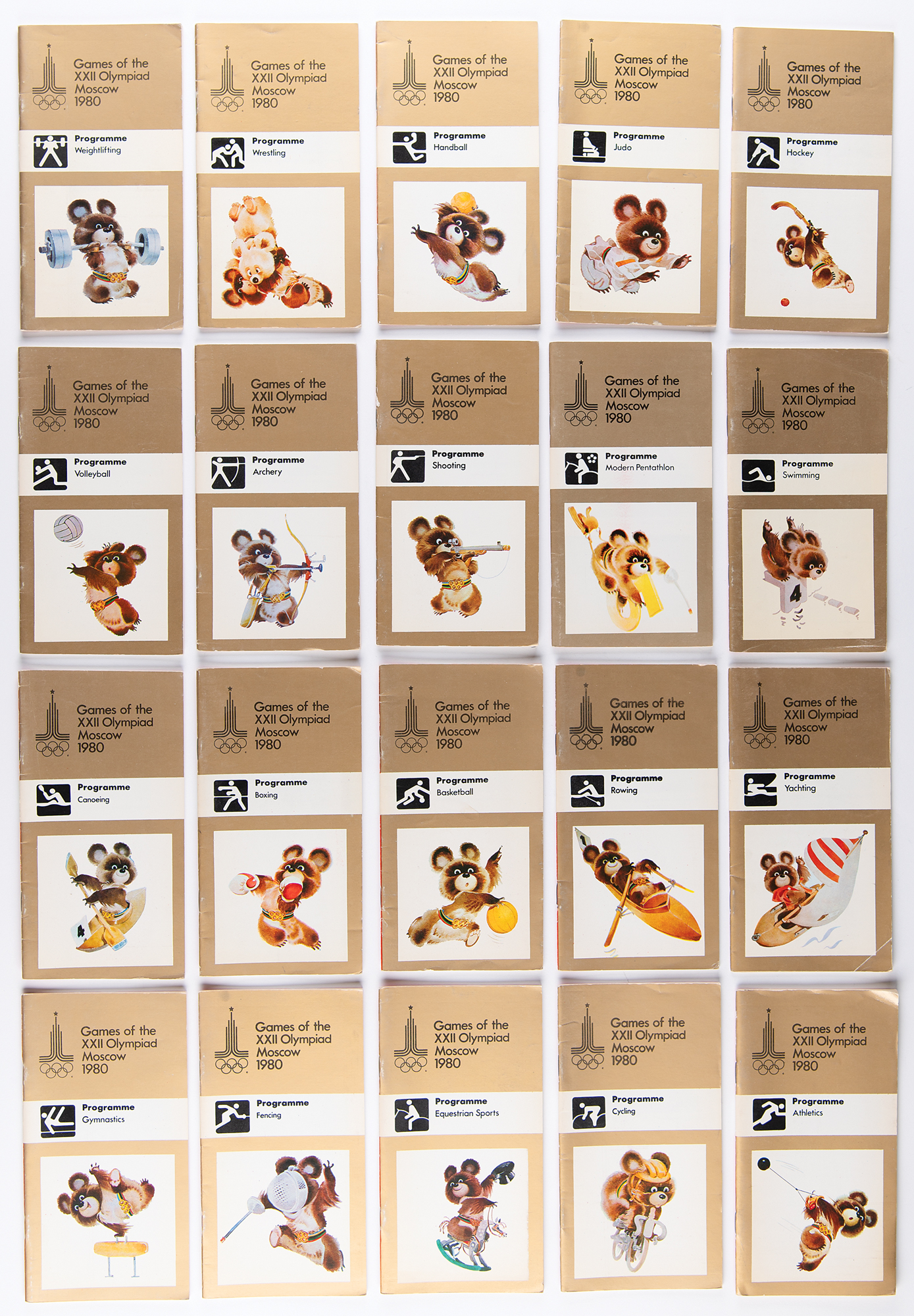 Group of 21 original event programs from the Moscow 1980 Summer Olympics, including: Archery, Athletics, Basketball, Boxing, Canoeing, Cycling, Equestrian Sports, Fencing, Field Hockey, Gymnastics, Handball, Judo, Modern Pentathlon, Rowing, Shooting, Swimming, Volleyball, Weightlifting, Wrestling, and Yachting, plus the French-language version of the "Programme des Competitions sportives." In overall very good to fine condition.