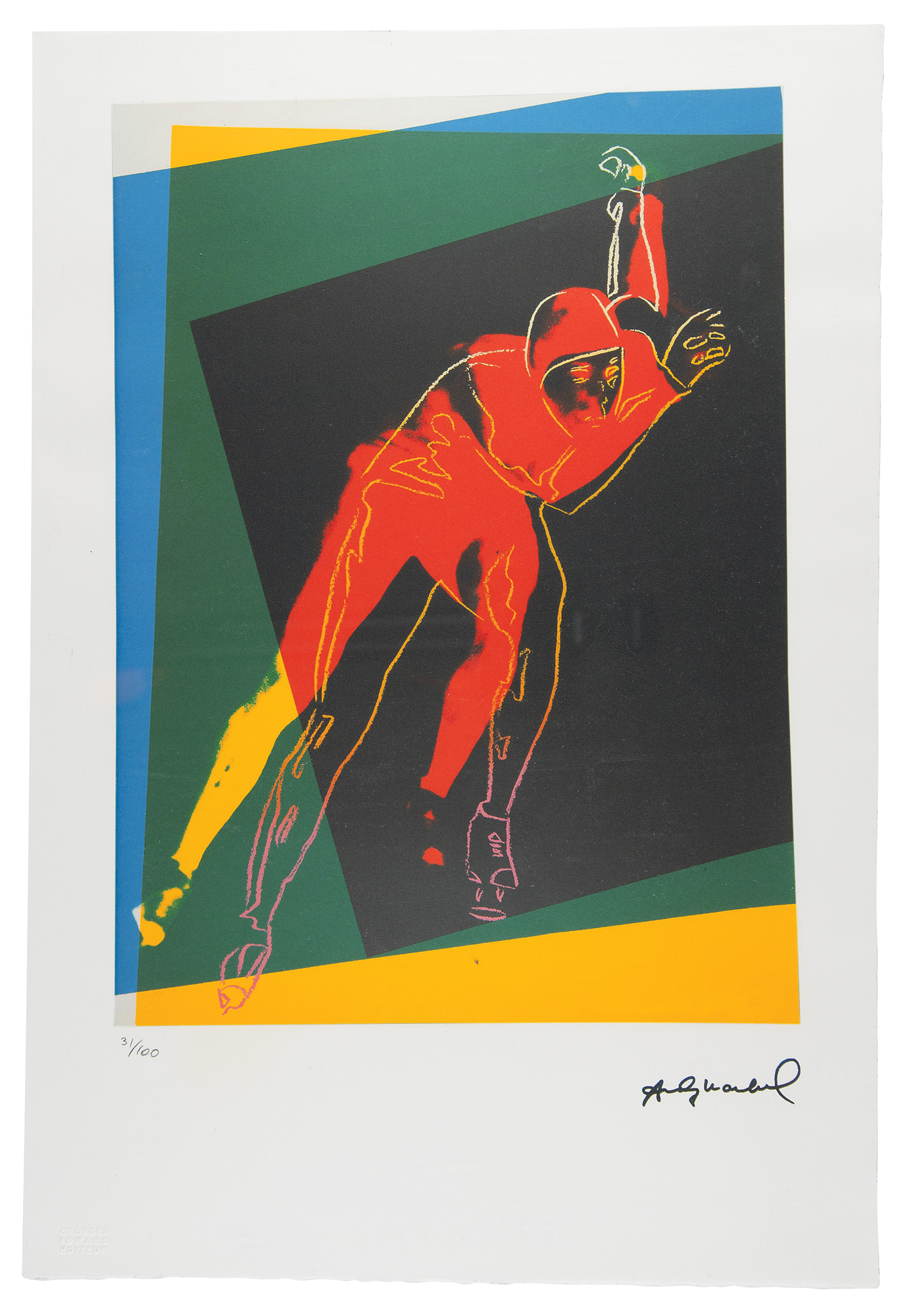 Limited edition color 15.25 x 22.25 lithograph of Andy Warhol's 1983 screenprint entitled 'Speed Skater,' numbered 31/100, printed on Arches paper and edited by Georges Israel. The lower right bears a printed facsimile Warhol signature. The reverse bears a stamp from the Leo Castelli Gallery. Rolled and in very fine condition. Warhol's Speed Skater was used for the official Sarajevo Winter Olympics poster.