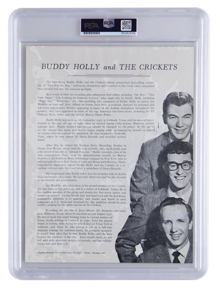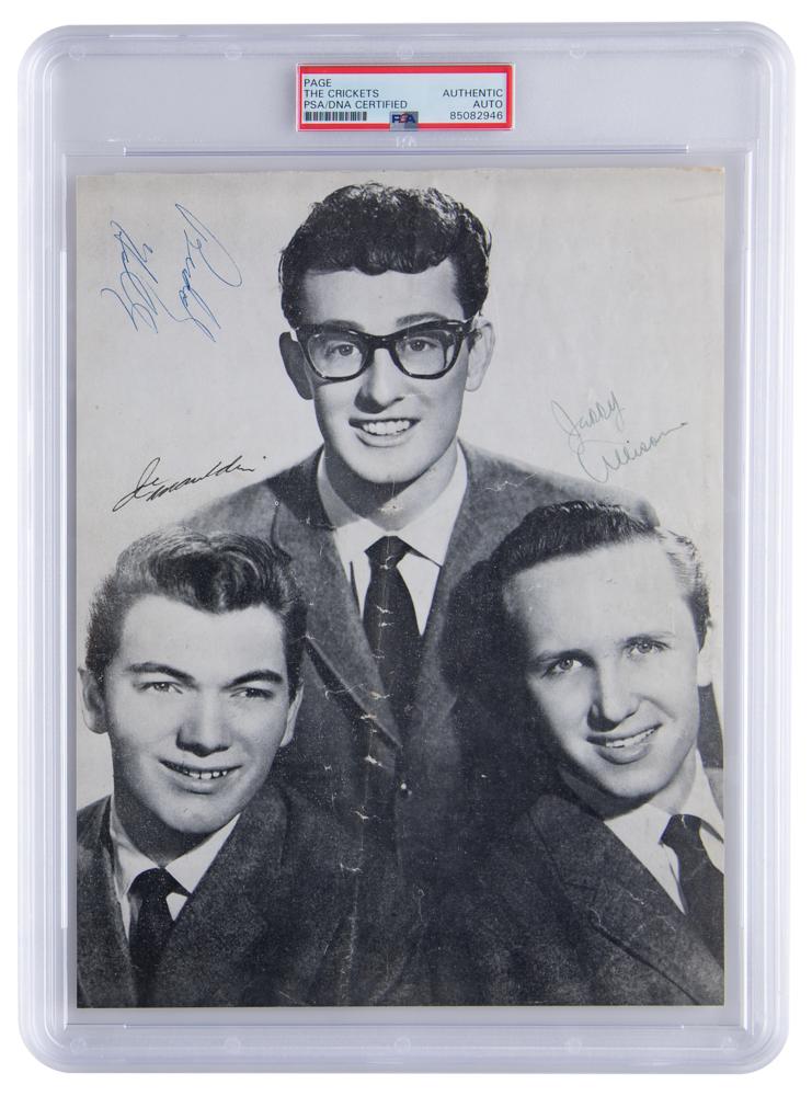 Scarce vintage 8 x 10.5 paperstock program photo of Buddy Holly and the Crickets, signed in blue ballpoint by Buddy Holly, and in fountain pen by Jerry Allison and Joe B. Mauldin. The reverse is imprinted with a biography of the band, listing some of their hits including 'That'll Be The Day,' 'Oh, Boy,' and 'Not Fade Away.' In fine condition. Encapsulated in a PSA/DNA authentication holder. A superb, large-format signed photo of Buddy Holly and the Crickets—much larger than the promo cards usually seen.
