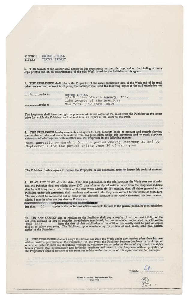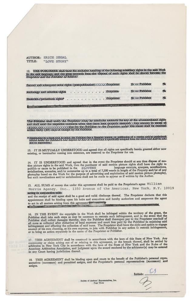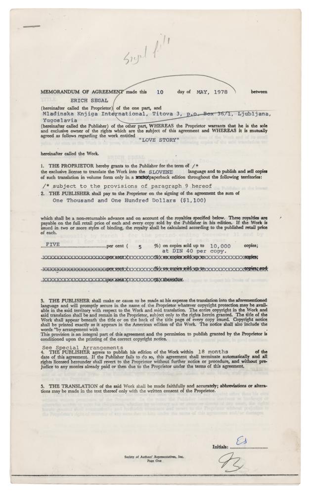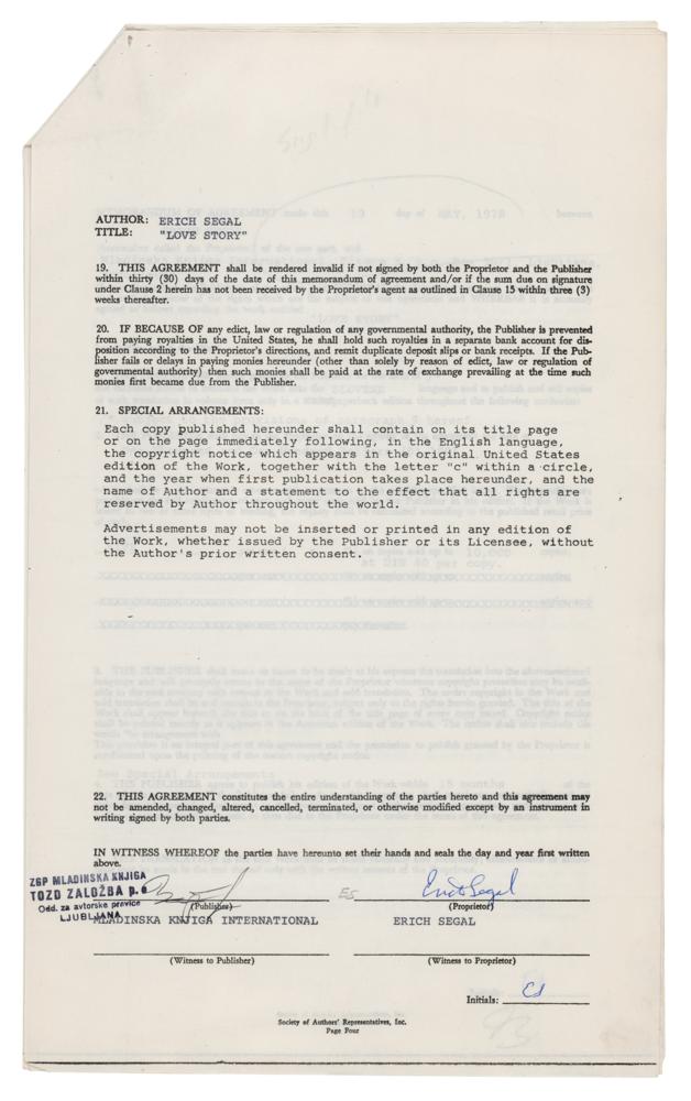 DS, four pages, 8.5 x 14, May 10, 1978. Agreement between Erich Segal and Mladinska Knjiga International regarding the novel "Love Story," by which he grants the "exclusive license to translate the Work into the Slovene language and to publish and sell copies of such translation." Signed at the conclusion in blue ballpoint by Erich Segal, and initialed by him at the bottom of each page. In fine condition.