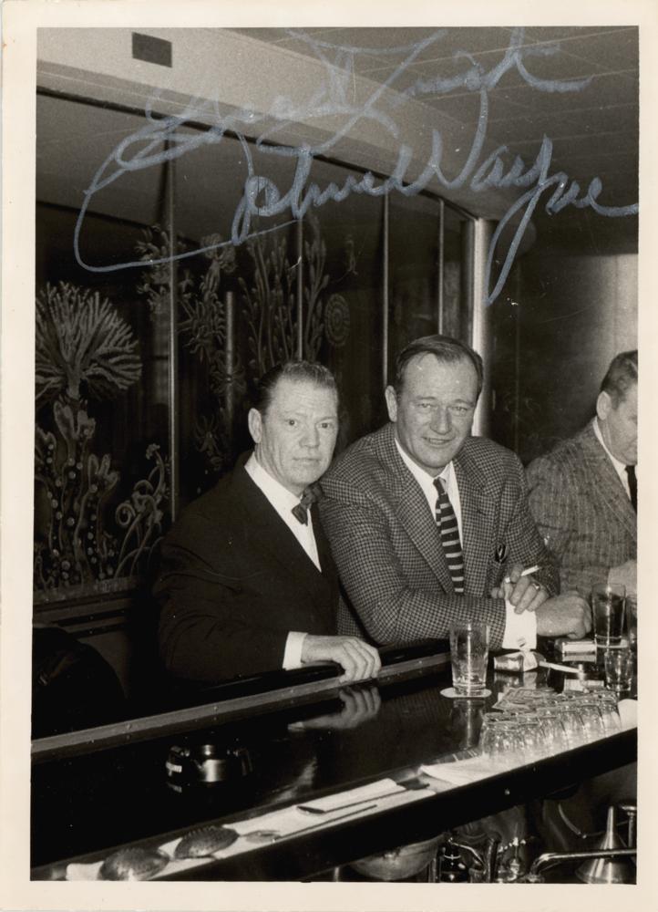 Vintage glossy 5 x 7 photo of Wayne seated and smoking at a bartop with another gentleman, signed in white grease pencil, "Good luck, John Wayne." In very good to fine condition, with scattered light creasing. Accompanied by a full letter of authenticity from JSA.