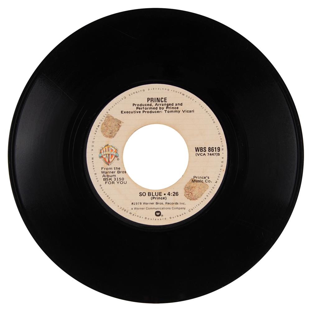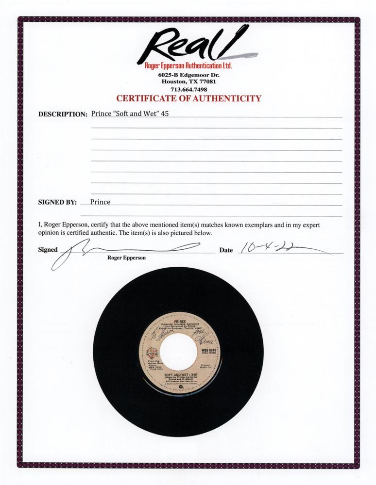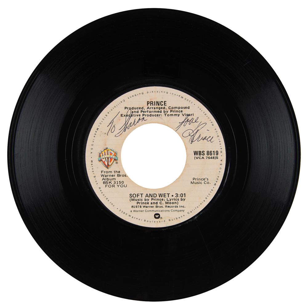Warner Bros. 45 RPM record of Prince's first solo single 'Soft and Wet / So Blue,' signed and inscribed on the label in black ballpoint, "To Sharon, love, Prince." In fine condition, with scratches to the vinyl and adhesive remnants to the B-side label. Accompanied by full letters of authenticity from REAL and JSA. 'Soft and Wet' was Prince's first solo single, released on June 7, 1978—his 20th birthday—from his debut album, For You. The song peaked at 92 on the Billboard Hot 100 on November 25, 1978, after two weeks on the chart. A stunning, early piece of Prince history.