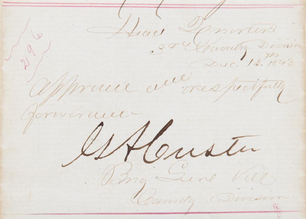 Civil War-dated endorsement, signed "G. A. Custer," on a 3.25 x 2.25 slip, dated at the Headquarters of the 3rd Cavalry Division, December 13, 1863. Custer signs an endorsement as commander of the 3rd Division, in full: "Approved and respectfully forwarded." Nicely mounted and suede-matted to an overall size of 18 x 15.75. In fine condition. Custer had been promoted to brigadier general on June 29, 1863, for his gallant conduct at Aldie, and went on to serve with distinction through the Gettysburg and Shenandoah Valley campaigns.