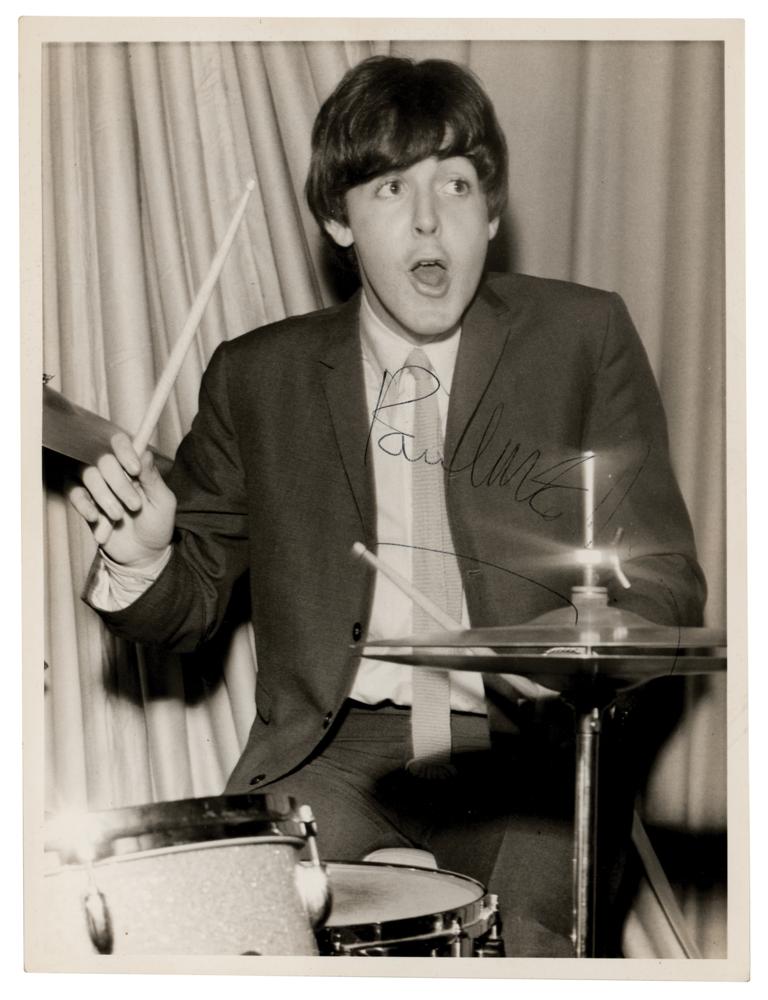 Rare vintage glossy 6.5 x 8.5 photo of Paul McCartney playing the drums during a Beatles concert at Caird Hall in Dundee, Scotland, on October 20, 1964, signed in black ballpoint by McCartney. The reverse bears a photography stamp attributed to Matt A. MacDonald. In fine condition. Accompanied by a letter of provenance from the wife of the original photographer/recipient: “On Tuesday the 20th October 1964 the Beatles performed at the Caird Hall Dundee. One of the professional photographers present was my late husband John T. Young. The attached photograph of Paul McCartney playing drums was taken by him, developed by him, and was signed in his presence at the post-concert party at the Four Seasons Hotel, St. Fillans, Perthshire.”