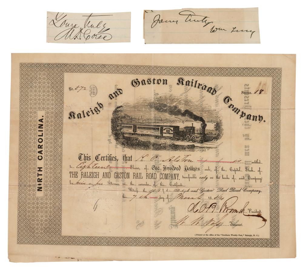 DS signed “L. O. B. Branch,” one page, 10.75 x 8, March 7, 1854, a stock certificate for 18 shares of the Raleigh and Gaston Railroad Company, signed by Lawrence O'Bryan Branch as president and William W. Vass as treasurer. Branch (1820-1862) graduated first in his class at Princeton in 1838, fought in the Seminole Wars, and was a U.S. Congressman when the Civil War began. As the senior brigadier general in Genl. A. P. Hill's Division (Stonewall Jackson's Corps), he saved General Robert E. Lee's right flank from defeat at the battle of Antietam. After the battle, while speaking with Generals Hill and Lee, he was shot through the head by a Union sharpshooter, killing him instantly. Branch is quite scarce in autograph form.