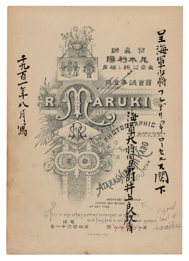 Career naval officer and admiral (1845-1929) in the Imperial Japanese Navy during Meiji-period Japan, who served as the first Commandant of the Imperial Japanese Naval Academy. Rare 5 x 7.25 cabinet photo of Yoshika in his impressive military uniform, signed and inscribed on the reverse in Japanese characters (translated): “Presented to his Excellency Rear Admiral Fredericky Rawselsoo, Admiral Baron Inoue Yoshika, Shot in August 1901.” Published by Riyou Maruki of Tokyo. In fine condition.