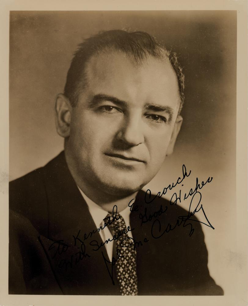 Vintage glossy 8 x 10 portrait photo of the Communist-hunting demagogue, signed and inscribed in fountain pen, "To Kenneth E. Crouch, With Sincere Good Wishes, Joe McCarthy.” In fine condition.