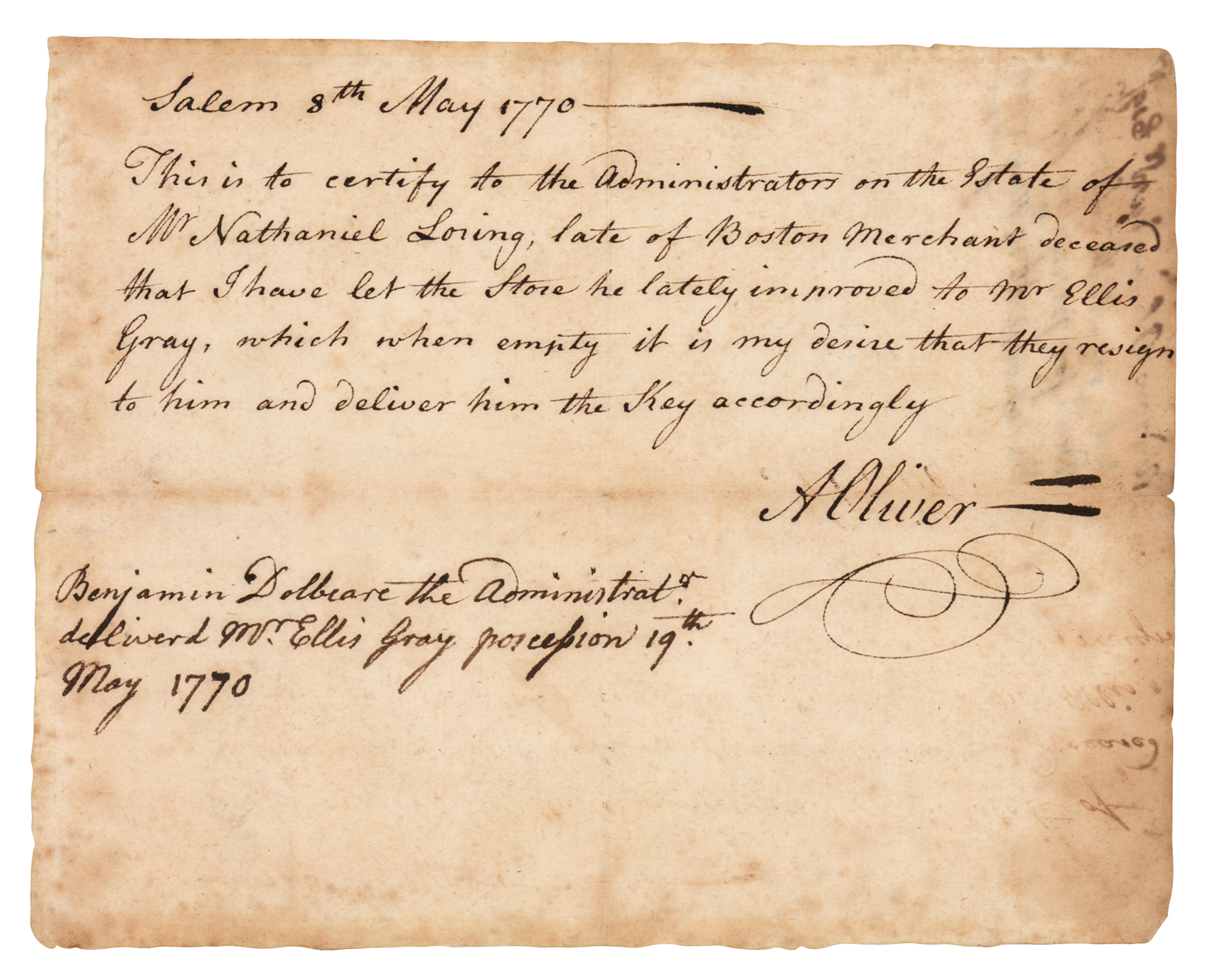 American jurist and scientist (1731-1799) who, along with John Adams, helped found the American Academy of Arts and Sciences in Massachusetts; inspired by Benjamin Franklin and other contemporaries, he asserted that electricity permeates the air and studied its role in causing thunderstorms. Manuscript DS, signed “A. Oliver,” one page, 6.25 x 5, May 8, 1770. Addressed from Salem, a document issued to administrator Benjamin Dolbeare, which reads: “This is to certify to the Administrators on the Estate of Mr. Nathaniel Loring, late of Boston Merchant deceased that I have let the Store he lately improved to Mr. Ellis Gray, which when empty it is my desire that they resign to him and deliver him the Key accordingly.” Signed boldly at the conclusion by Andrew Oliver. In fine condition, with scattered light staining.