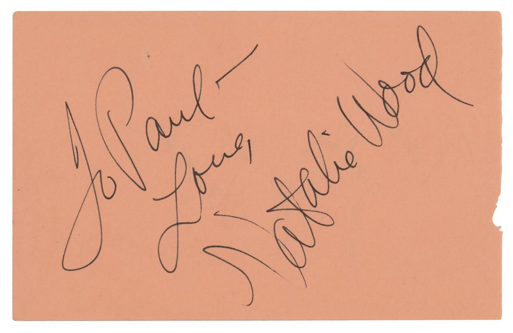 Vintage ink signature and inscription, "To Paul — Love, Natalie Wood,” on a peach-colored 6.25 x 4 album page, the reverse of which is signed by Julie Newmar. In very fine condition.