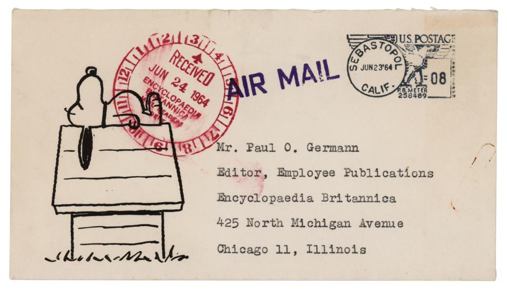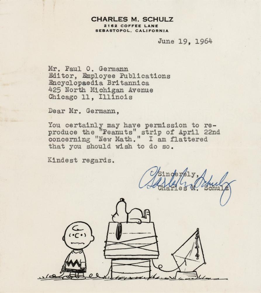 TLS signed “Charles M. Schulz,” one page, 6.25 x 7, personal 'Charlie Brown and Snoopy' illustrated letterhead, June 19, 1964. Letter to Paul O. Germann, an editor at Encyclopedia Britannica, in full: “You certainly have permission to reproduce the ‘Peanuts’ strip of April 22nd concerning ‘New Math.’ I am flattered that you should wish to do so.” In fine condition, with several light paperclip impressions. Accompanied by the original 'Snoopy' mailing envelope.