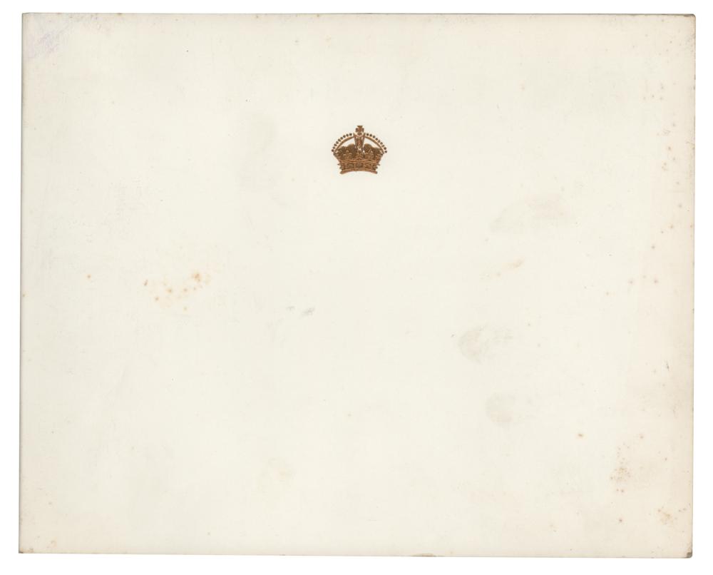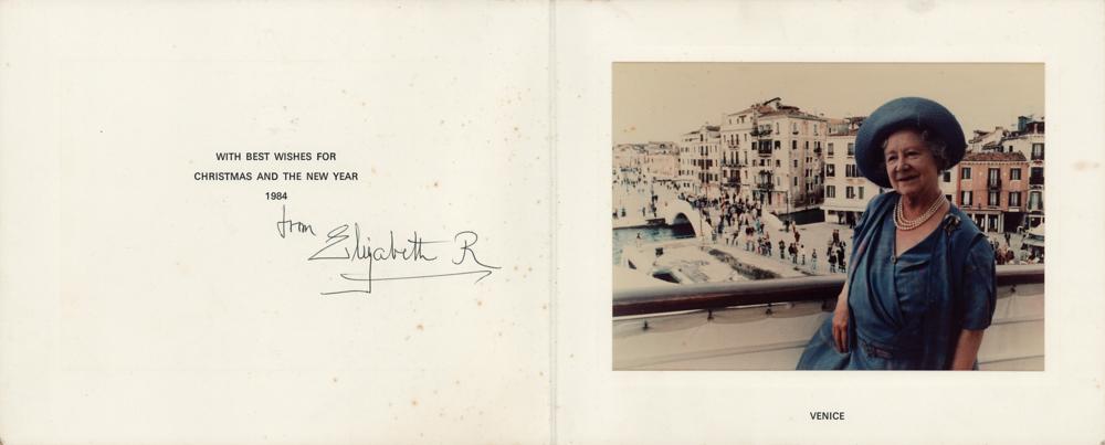 Royal Christmas card for 1984 with an embossed crown on the front, measuring 18 x 7.25 open, with the inside bearing an affixed image of the Queen Mother posing on a balcony in Venice, signed below the printed greeting in black ballpoint, "from Elizabeth R." In very good to fine condition, with scattered light foxing and soiling.