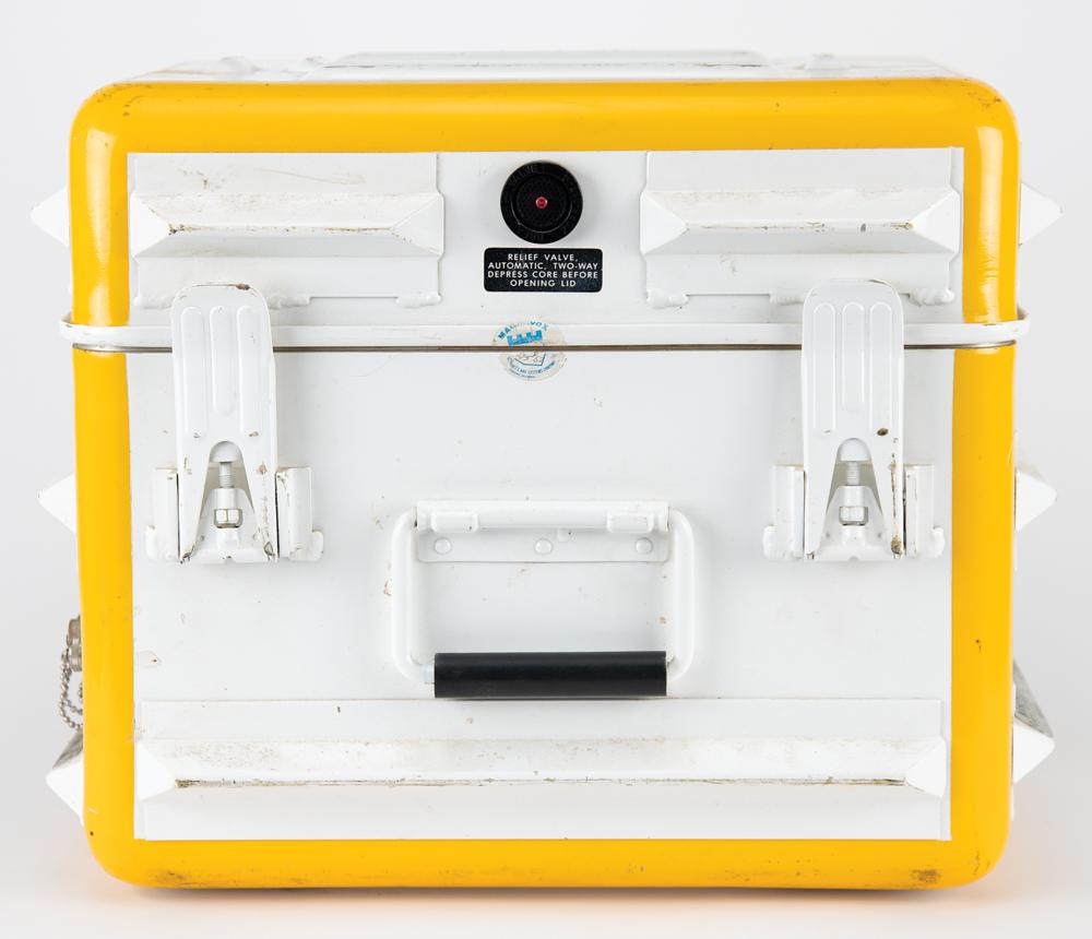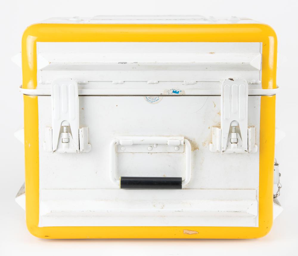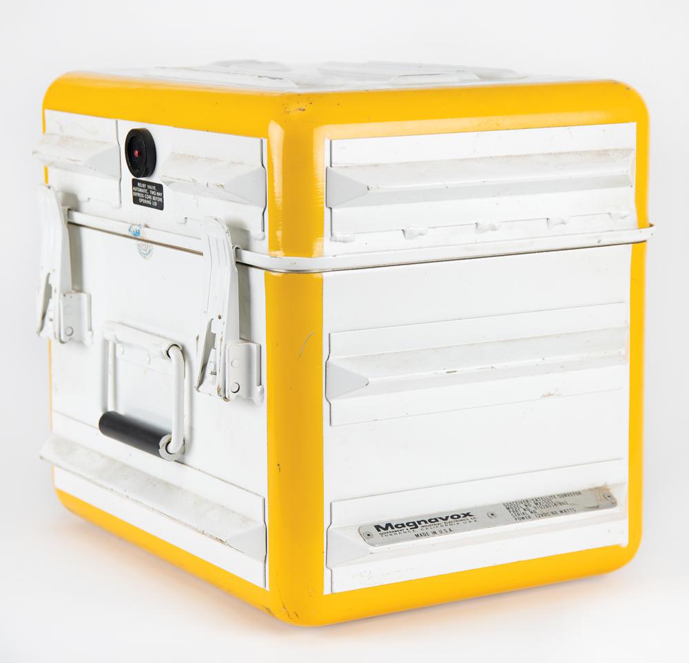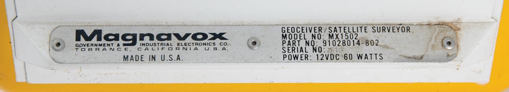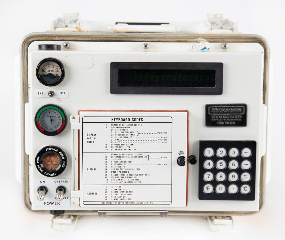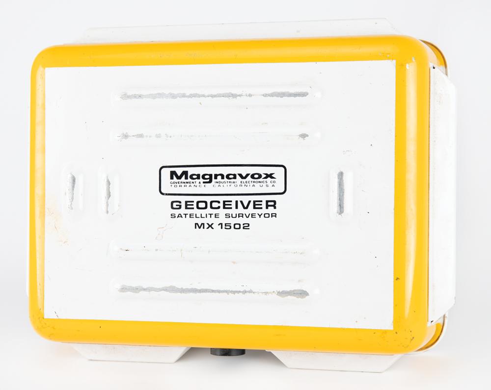 Geoceiver Satellite Surveyor MX 1502 manufactured by Magnavox circa 1979, measuring 17″ x 14″ x 13.5″ and weighing 46 pounds, with the front and back featuring carrying handles and spring-loaded locking clasps for the upper lid, which when removed reveals the main instrument panel with keypad, keyboard codes, switches, meters, digital window, and a tape cassette compartment. The underside of the lid also bears a detailed “Keyboard Codes” information plate. The parts label to the lower right reads: “Magnavox, Government & Industrial Electronics Co., Geoceiver / Satellite Surveyor, Model No. MX1502, Part No. 91028014-802, Serial No. 366, Power: 12VDC 60 Watts.” A few Magnavox labels affixed to the exterior are dated to 1982 and 1983. In fine condition, with scattered scuffs and marks.