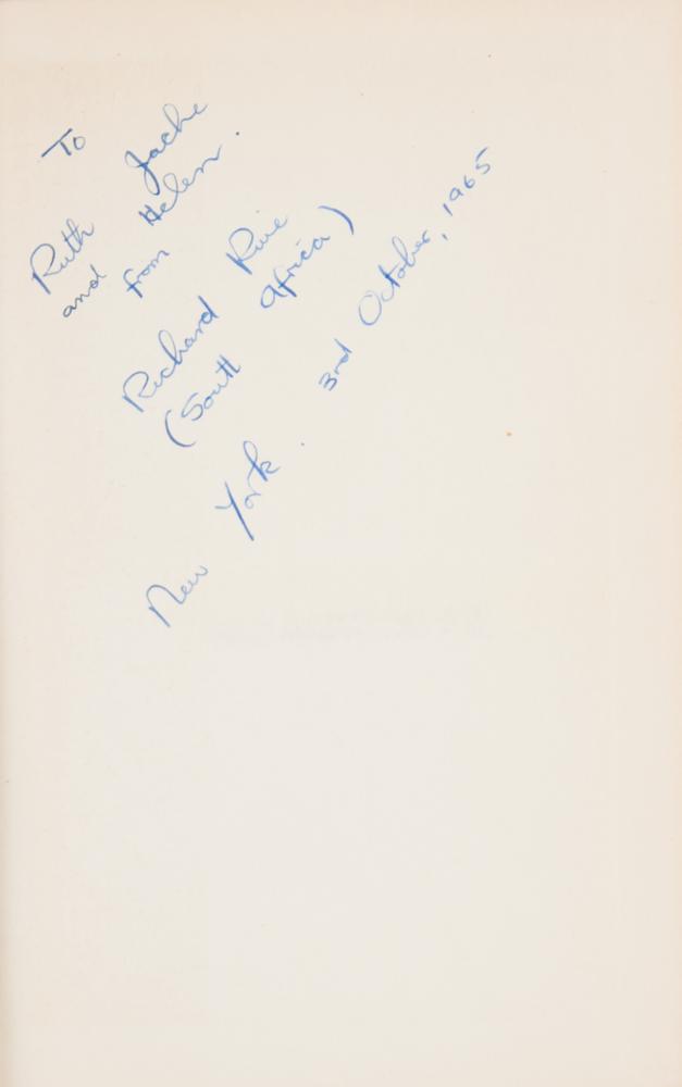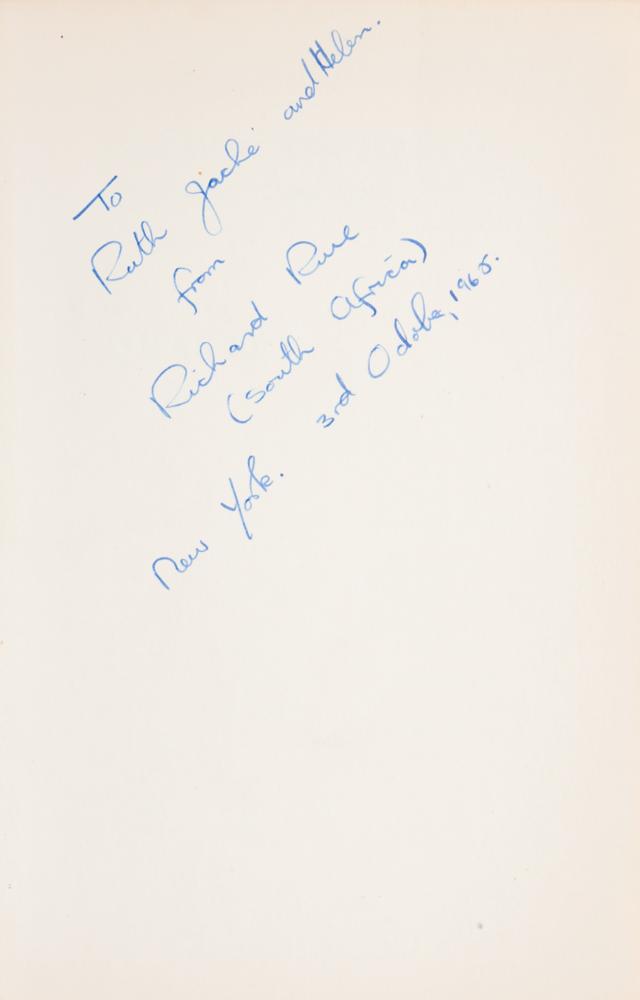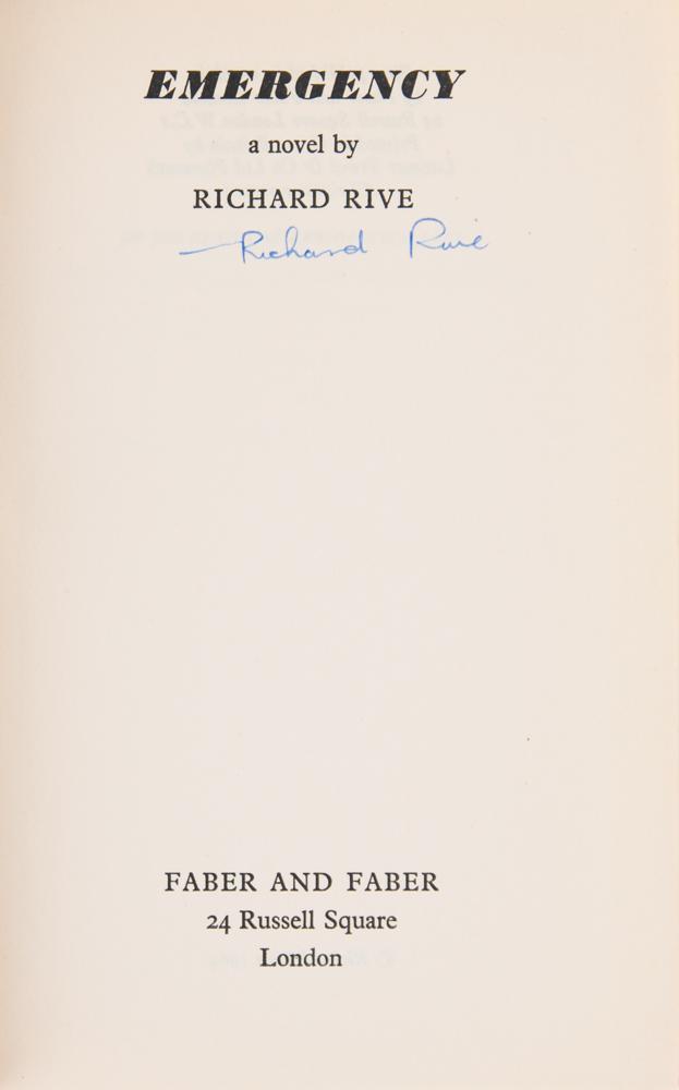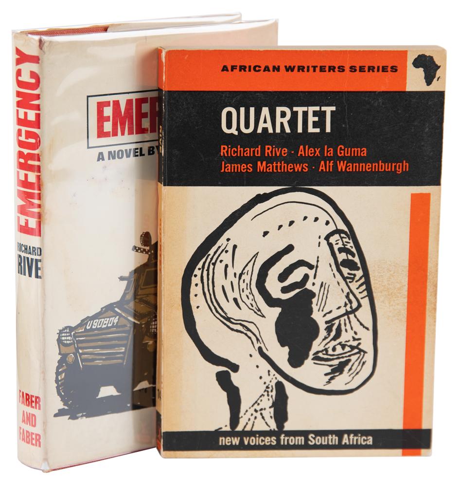 South African writer and academic (1931-1989) who was a firm believer in anti-racism and has been recognized for his contributions to the fight against apartheid through literature; he was stabbed to death at his home in Cape Town at age 58. Two books signed by Rive: a scarce first edition of his first novel, Emergency, hardcover with dust jacket, published by Faber and Faber in 1964, signed on the title page in fountain pen, "Richard Rive," and signed and inscribed on the first free end page, "To Ruth, Jache, and Helen, from Richard Rive (South Africa), New York, 3rd October 1965"; and a paperback edition of African Writers Series 14: Quartet, New Voices From South Africa, published by Heinemann Educational Books in 1965, signed and inscribed on the first free end page in fountain pen, "To Ruth, Jache, and Helen, from Richard Rive (South Africa), New York, 3rd October 1965." In overall very good to fine condition, with light stains to the dust jacket of Emergency.