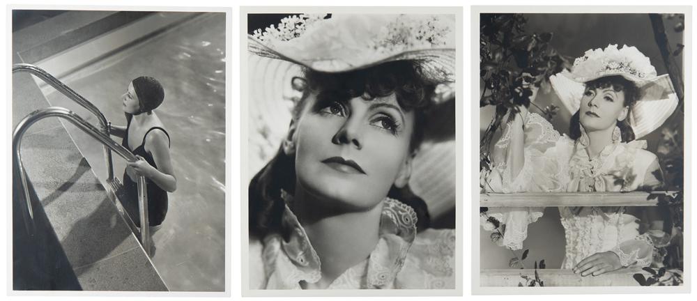 Three original vintage matte-finish 10 x 13 silver gelatin photographs of Greta Garbo, one of which shows her in a pool in the 1941 film Two-Faced Woman, and the other two of Garbo as the title star of the 1935 film Anna Karenina, the latter two taken by renowned MGM portrait photographer Clarence Sinclair Bull, whose credit stamp is on the reverse of both. In overall fine condition.