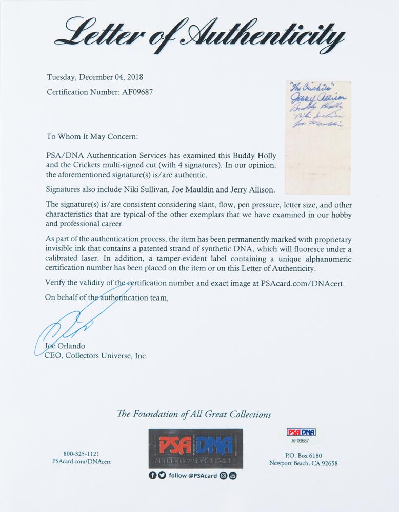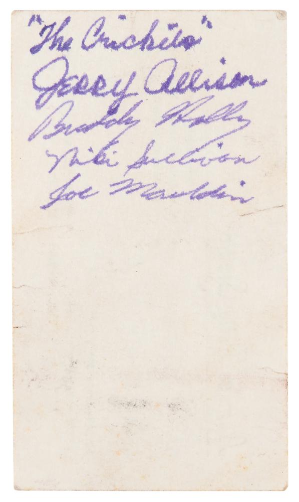 Extremely rare purple ink signatures of Buddy Holly, Niki Sullivan, Joe Mauldin, and Jerry Allison, who adds "'The Crickets,'" on the reverse of a 3.5 x 2 business card from Norman Petty Studios in Clovis, New Mexico. In fine condition, with light soiling and a few small edge creases. Accompanied by a full letter of authenticity from PSA/DNA. Norman Petty was an American musician, record producer, publisher, and radio station owner (1927-1984) who is considered to be one of the founding fathers of early rock & roll. Petty produced the majority of Buddy Holly's recordings from 1956 through 1958 at his Clovis studio. Autographs of Buddy Holly and the Crickets are rare and highly sought after.