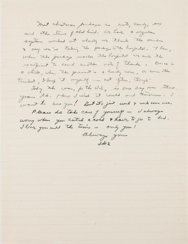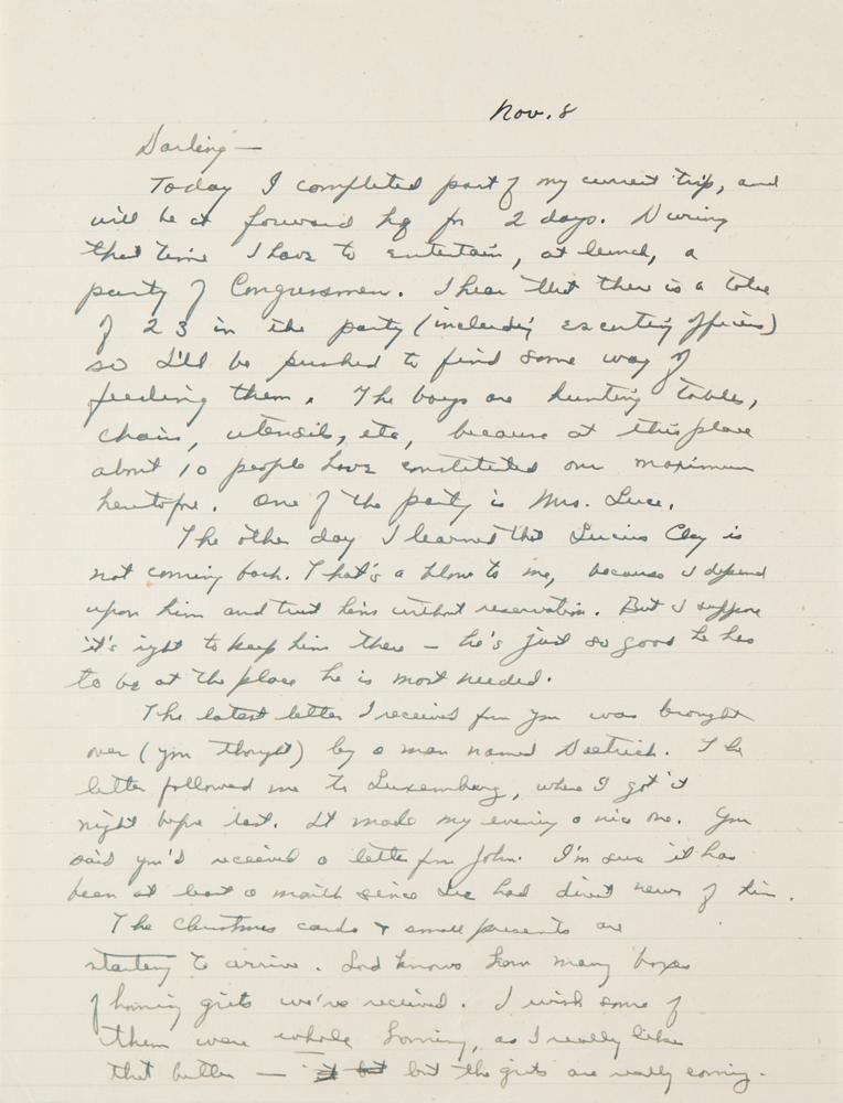 Exceptional World War II-dated ALS signed "Ike," two pages, 8 x 10.5, [December 8, 1944, erroneously dated "Nov. 8"]. Handwritten letter home to his wife Mamie, in part: "Today I completed part of my current trip, and will be at forward h.q. for 2 days. During that time I have to entertain, at lunch, a party of Congressmen. I hear that there is a total of 23...so I'll be pushed to find some way of feeding them. The boys are hunting tables, chairs, utensils, etc...The other day I learned that Lucius Clay is not coming back. That's a blow to me, because I depend upon him and trust him without reservation. But I suppose it's right to keep him there-he's just so good he has to be at the place he is most needed...The Christmas cards & small presents are starting to arrive. Lord knows how many boxes of hominy grits we've received...Most Christmas packages are nuts, candy, sox and other items of that kind. We have a regular system worked out where we thank the sender & say we're taking the package to the hospital. Then, when the package reaches the hospital we ask the recipient to send another note of thanks. Once in a while, when the present is a lucky coin, or some other trinket, I keep it myself...Today the war, for the U.S., is one day over three years old. How I wish it would end tomorrow. I want to see you! But it's just work & work some more." In fine condition. A remarkable example of one of General Eisenhower's letters home from the front.