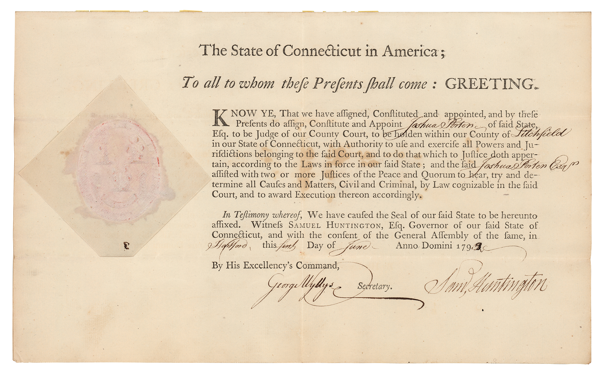 Signer of the Declaration of Independence from Connecticut (1731-1796) and seventh president of the Continental Congress. Partly-printed DS, signed “Sam'l Huntington,” one page, 13 x 8, June 1, 1793. As governor of Connecticut, Huntington appoints Joshua Porter "of said State...to be Judge of our County Court, to be holden within our County of Litchfield.” Prominently signed at the conclusion by Governor Samuel Huntington and countersigned by Secretary George Wyllys. The embossed white paper seal affixed to the left side remains intact. In fine condition.