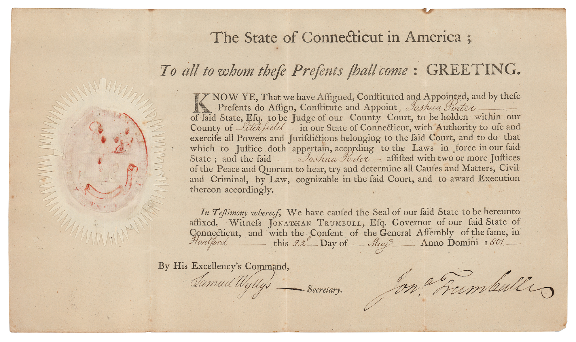 American soldier and politician (1740–1809) who served as paymaster general in the Continental Army and as George Washington's aide-de-camp; he later served as governor of Connecticut and as the second Speaker of the US House of Representatives. Partly-printed DS, signed “Jon:a Trumbull,” one page, 12.25 x 7.25, May 22, 1807. As governor of Connecticut, Trumbull appoints Joshua Porter as “of said State…to be Judge of our County Court, to be holden within our County of Litchfield.” Signed at the conclusion by Governor Trumbull and countersigned by Secretary Samuel Wyllys. The left side retains the original ornate white paper seal. In fine condition.