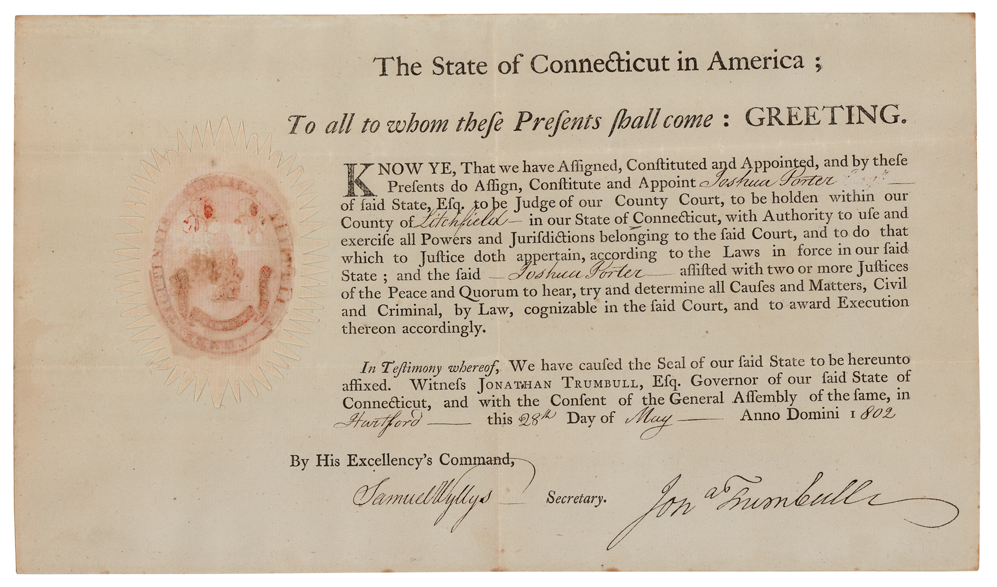 American soldier and politician (1740–1809) who served as paymaster general in the Continental Army and as George Washington's aide-de-camp; he later served as governor of Connecticut and as the second Speaker of the US House of Representatives. Partly-printed DS, signed “Jon'a Trumbull,” one page, 12.25 x 7.25, May 28, 1802. As governor of Connecticut, Trumbull appoints Joshua Porter as “of said State…to be Judge of our County Court, to be holden within our County of Litchfield.” Signed at the conclusion by Governor Trumbull and countersigned by Secretary Samuel Wyllys. The left side retains the original ornate white paper seal. In fine condition.
