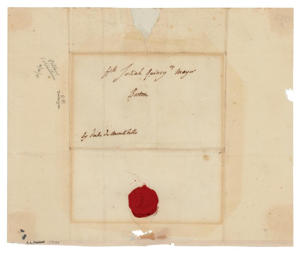 Mailing envelope addressed in the hand of Marquis de Lafayette, unsigned, measures 8.75 x 7.25 unfolded, which reads: “Hble Josiah Quincy Esq. Mayor, Boston, By Duke de Montebello.” The lower portion retains the original red wax seal. In fine condition, with some seal-related damage to the wide borders, not at all affecting the franking portion.