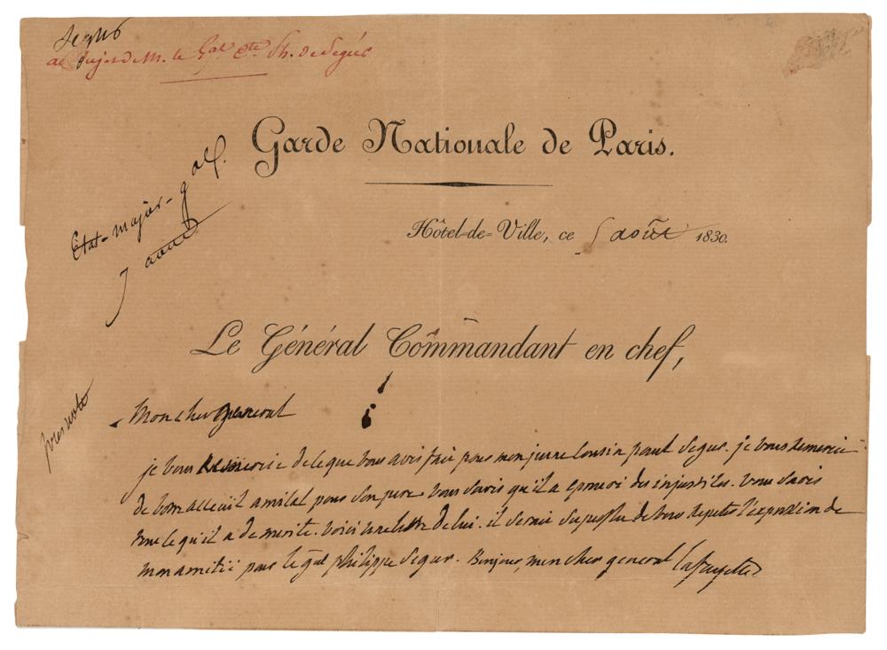 French statesman and military officer (1757-1834) who became an intimate associate of George Washington, and who advanced the American cause on both sides of the Atlantic. Though he espoused many of the principles behind the French Revolution while advocating a limited monarchy, extremist elements in the French Assembly declared him a traitor, whereupon he was jailed for five years. In 1824-1825 he revisited America, where he was hailed as a hero and granted a generous stipend and parcel of land. ALS in French, signed “Lafayette,” one page, 8 x 5.75, Garde Nationale de Paris letterhead, August 9, 1830. Untranslated handwritten letter to a general. In fine condition, with intersecting folds and trimmed edges.