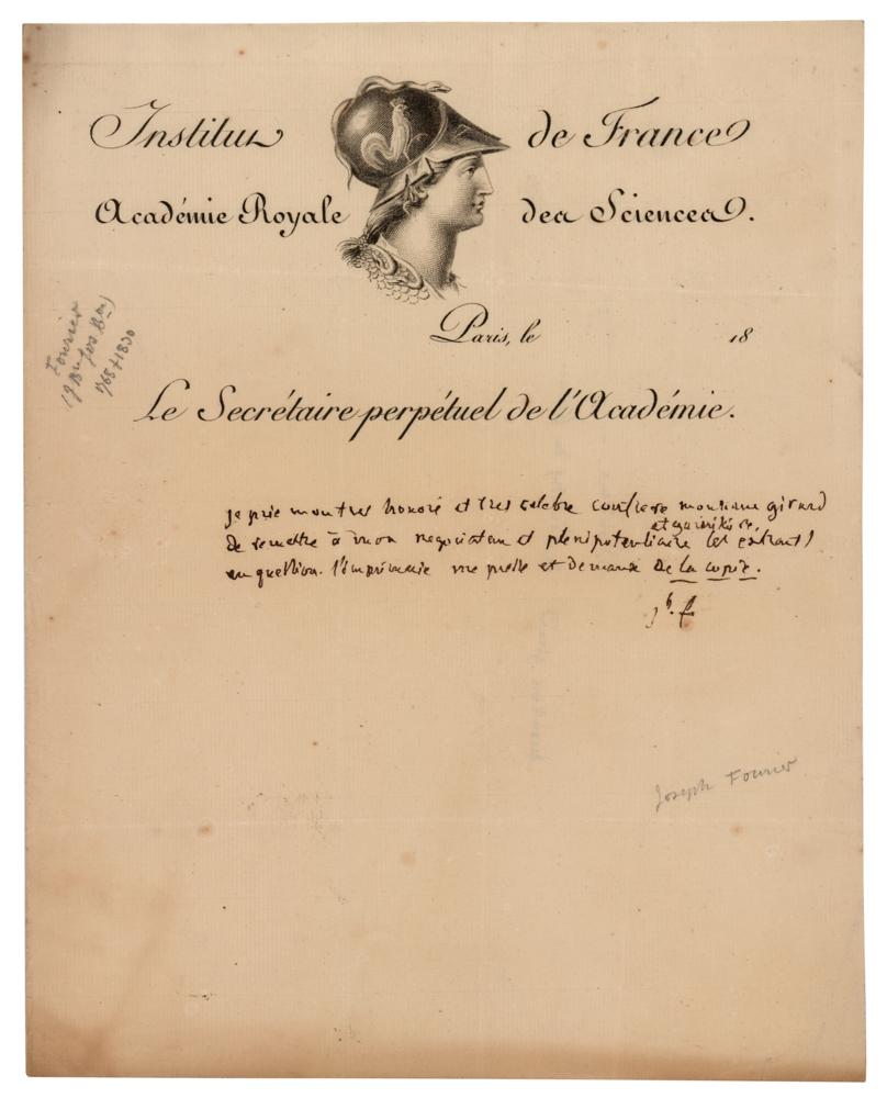 Prominent French mathematician and physicist (1768-1830) generally credited with the discovery of the 'greenhouse effect.' ALS in French, signed “J. F.,” one page, 7.75 x 9.75, Institut de France, Academie Royale des Sciences letterhead, no date. Brief untranslated handwritten letter by Joseph Fourier. In fine condition, with some slightly irregular toning.