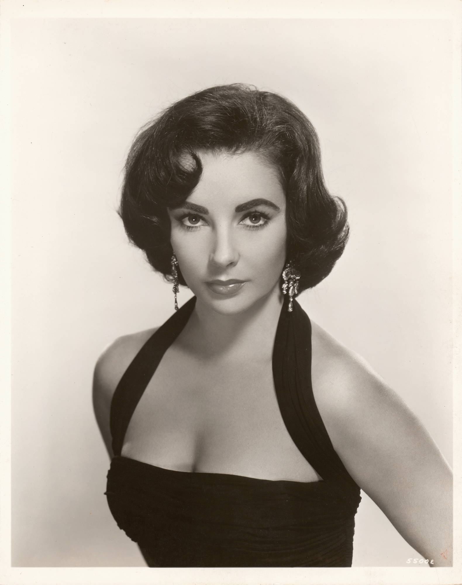 Beautiful vintage glossy 7.75 x 10 MGM studio portrait of Elizabeth Taylor in her prime, showing the actress staring into the camera and wearing a sleek dark dress and dazzling earrings. The reverse bears an “Elizabeth Taylor, Metro-Goldwyn-Mayer” stamp. In fine condition.