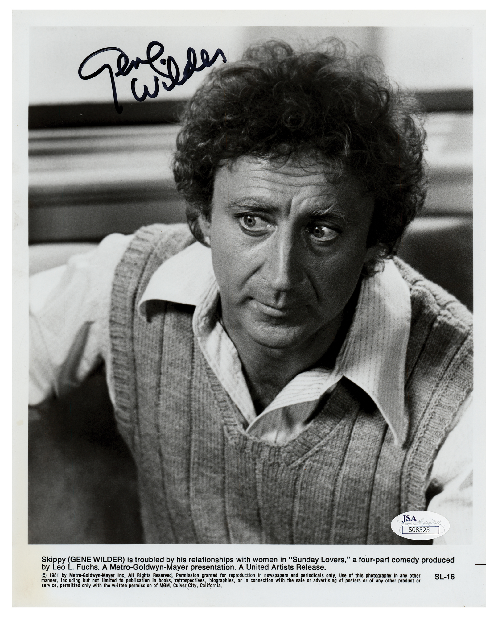 Glossy 8 x 10 MGM promo photo of Gene Wilder as Skippy in the 1981 romantic comedy Sunday Lovers, signed in black felt tip. In fine condition, with a JSA label affixed to the lower corner. Accompanied by a certificate of authenticity from JSA.
