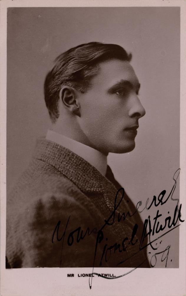 British actor (1885-1946) best known for his roles in such horror films as Mark of the Vampire and Son of Frankenstein and as Moriarty to Basil Rathbone's Sherlock Holmes. Vintage glossy 3.5 x 5.5 postcard photo, signed in fountain pen, "Yours sincerely, Lionel Atwill '09." In fine condition.