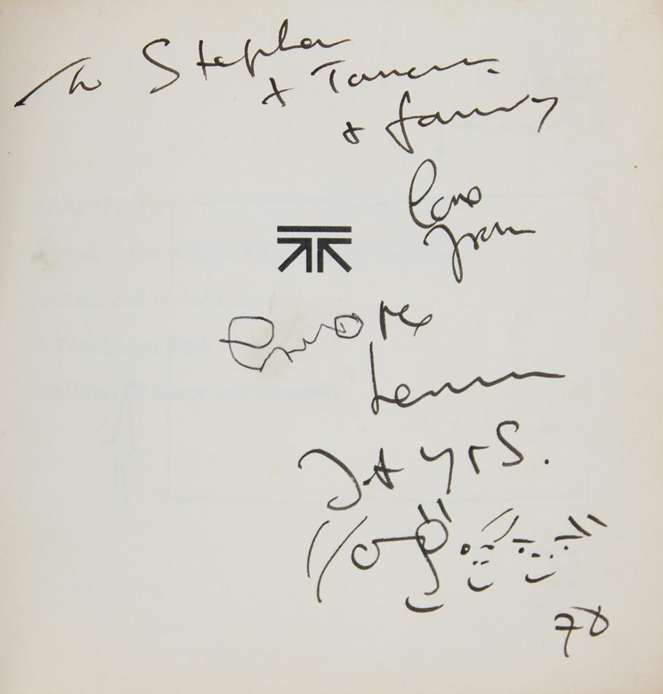 Signed book: Grapefruit. First Touchstone paperback edition. NY: Touchstone, 1971. Softcover, 5.25 x 5.25. Signed and inscribed on an opening page in black ink, "To Stephen + Tamara + family, love from, The Lennons, J + Y + S, 70,” with Lennon adding three portrait doodles of himself, his wife, Yoko, and his son, Sean. In very good to fine condition, with heavy wear to the covers and spine.