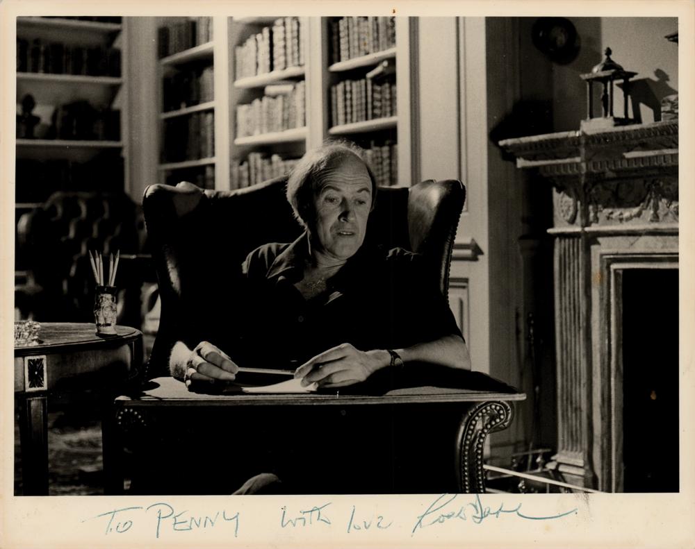 Glossy 10 x 8 photo of Dahl seated in a large armchair with a custom desktop, signed and inscribed in the lower border in blue ballpoint, "To Penny, with love, Roald Dahl.” In fine condition, with speckled silvering to some of the dark areas of the image.