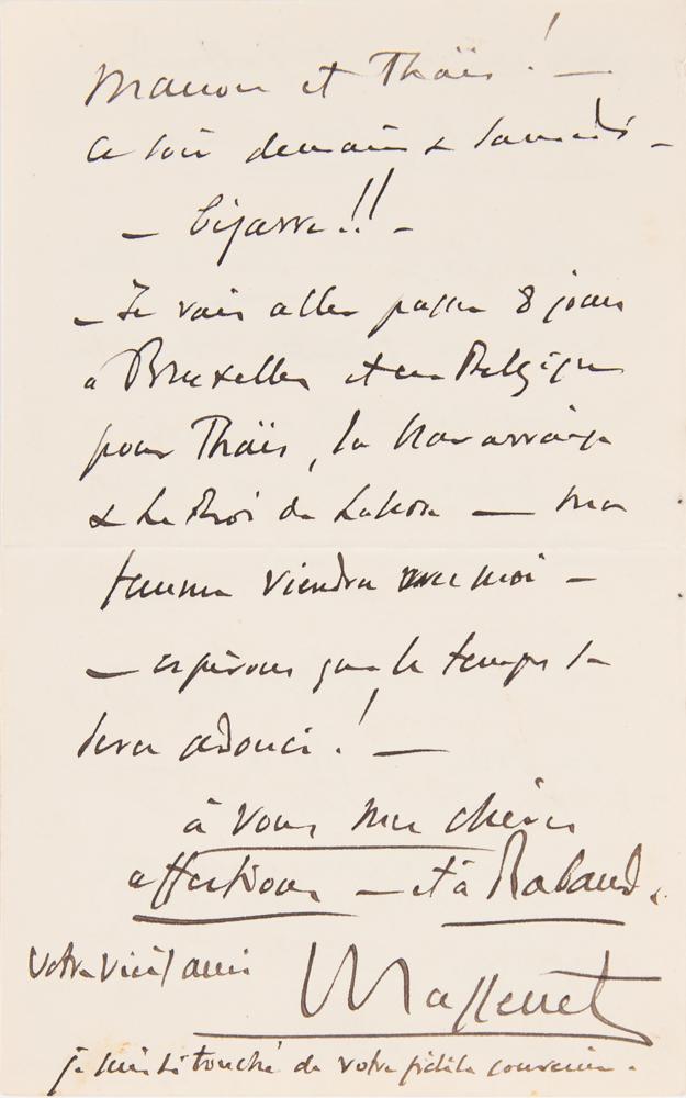January 31, 1895: Massenet gives his friend's address to someone in Bordeaux in order to "submit an opera poem, I believe. I often receive such proposals—and you will get used to it! Sometimes, however, an idea may arise... What are you doing? I want to know what your first shipment will be—I am counting on you—and I am waiting for something beautiful...Paris is in the snow, the mud, the cold. The theaters are quite full, however. They insist on playing Manon and Thaïs! tonight, tomorrow and Saturday—strange! I am going to spend 8 days in Brussels and in Belgium for Thaïs, la Navarraise and le Roi de Lahore."