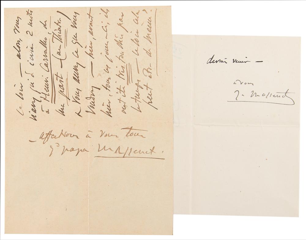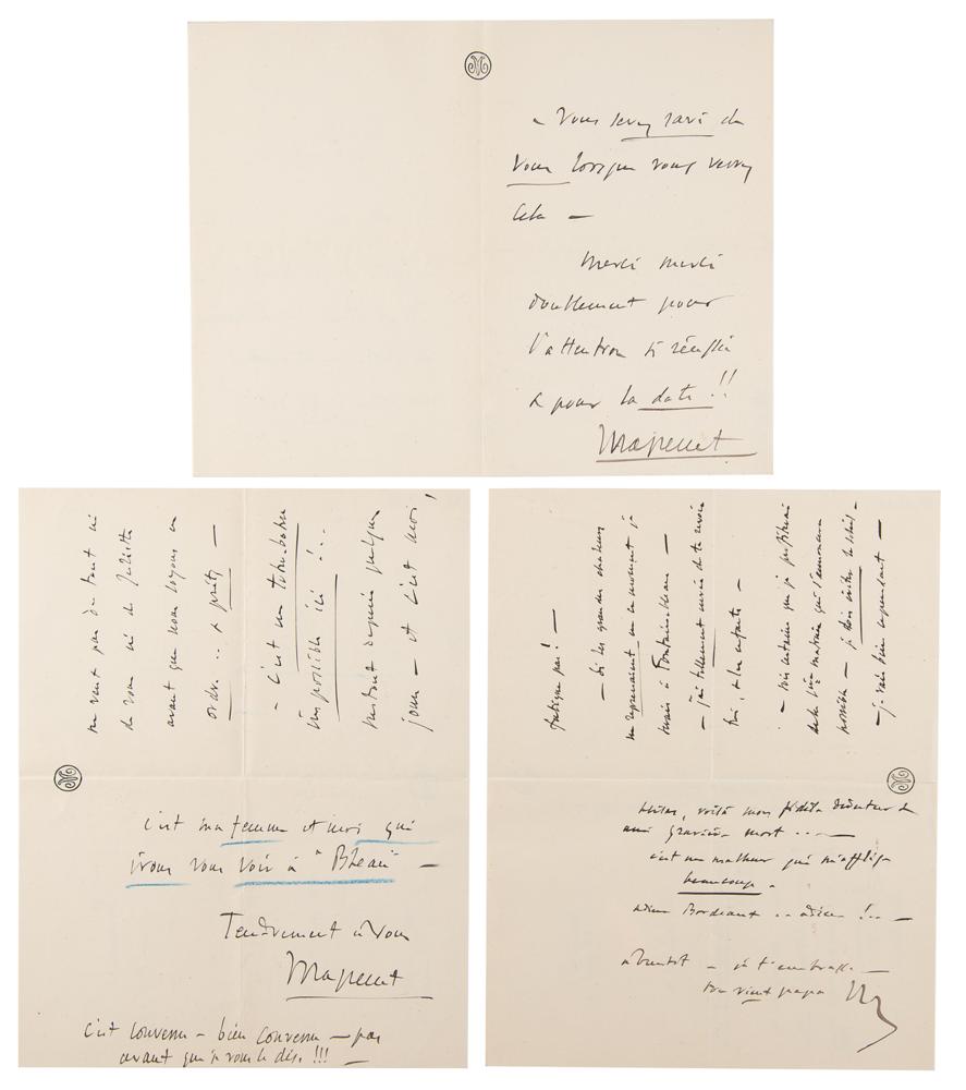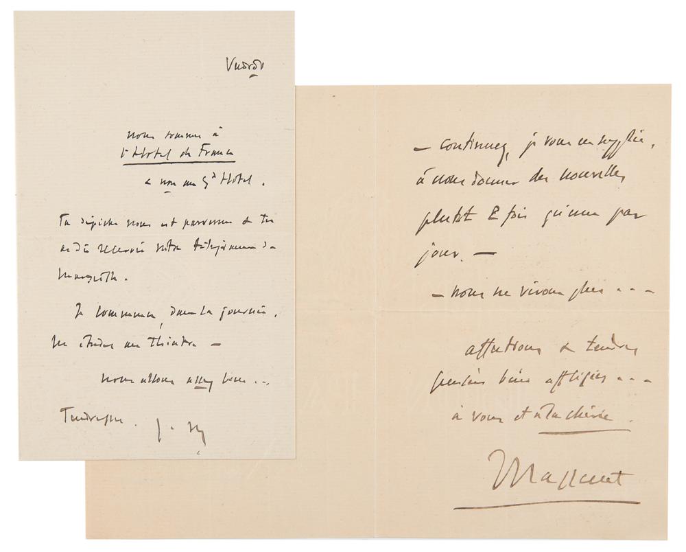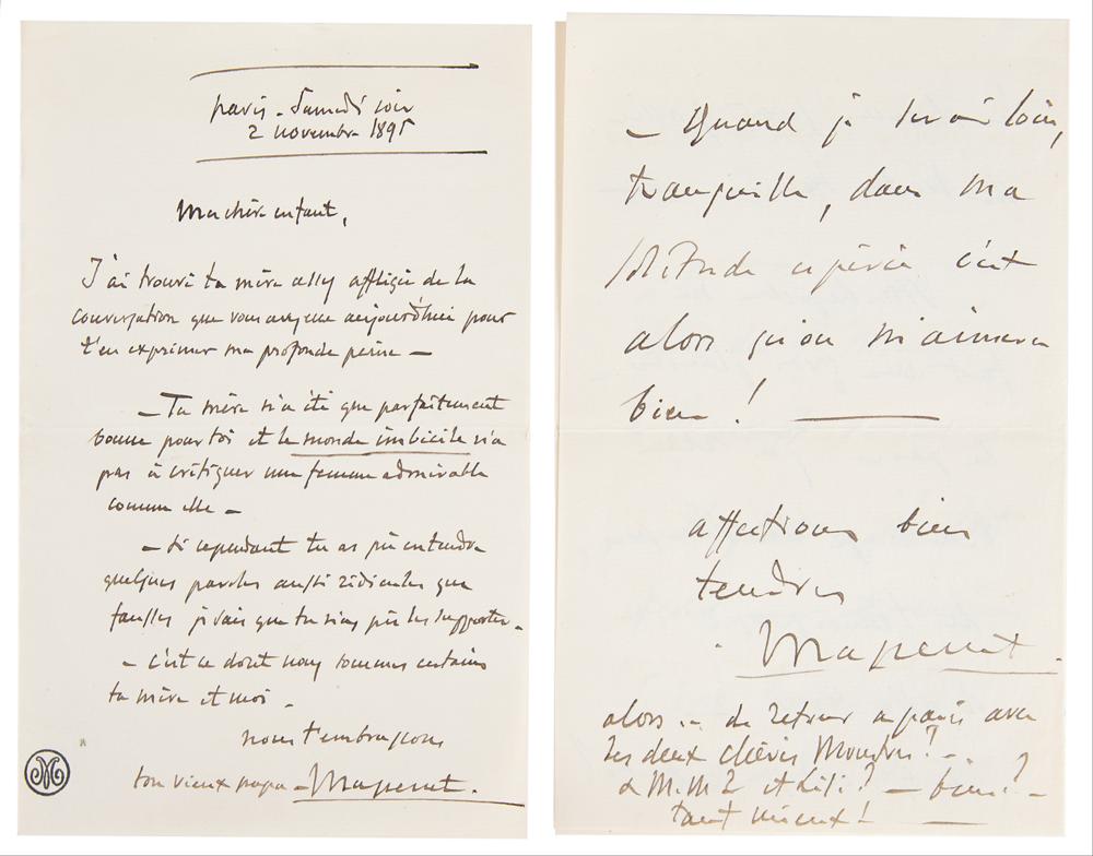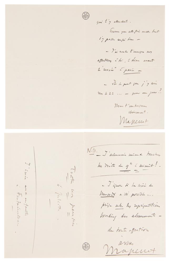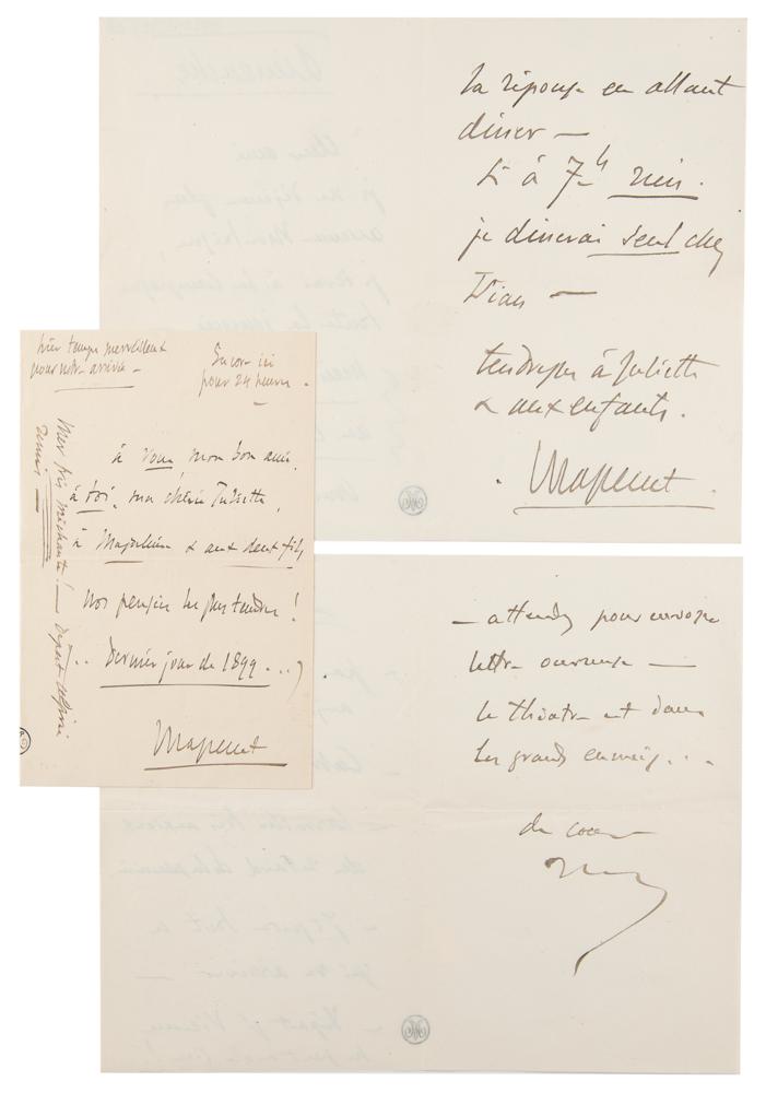 Remarkable collection of 19 autograph letters in French by Jules Massenet, mostly signed "J. Massenet" or "Massenet," with a few initialed or left unsigned, totaling over 40 pages, dated from 1895 to 1899. Most are written to his his daughter or son-in-law, Juliette and Léon Bessand, and several of his hand-addressed original mailing envelopes are included.