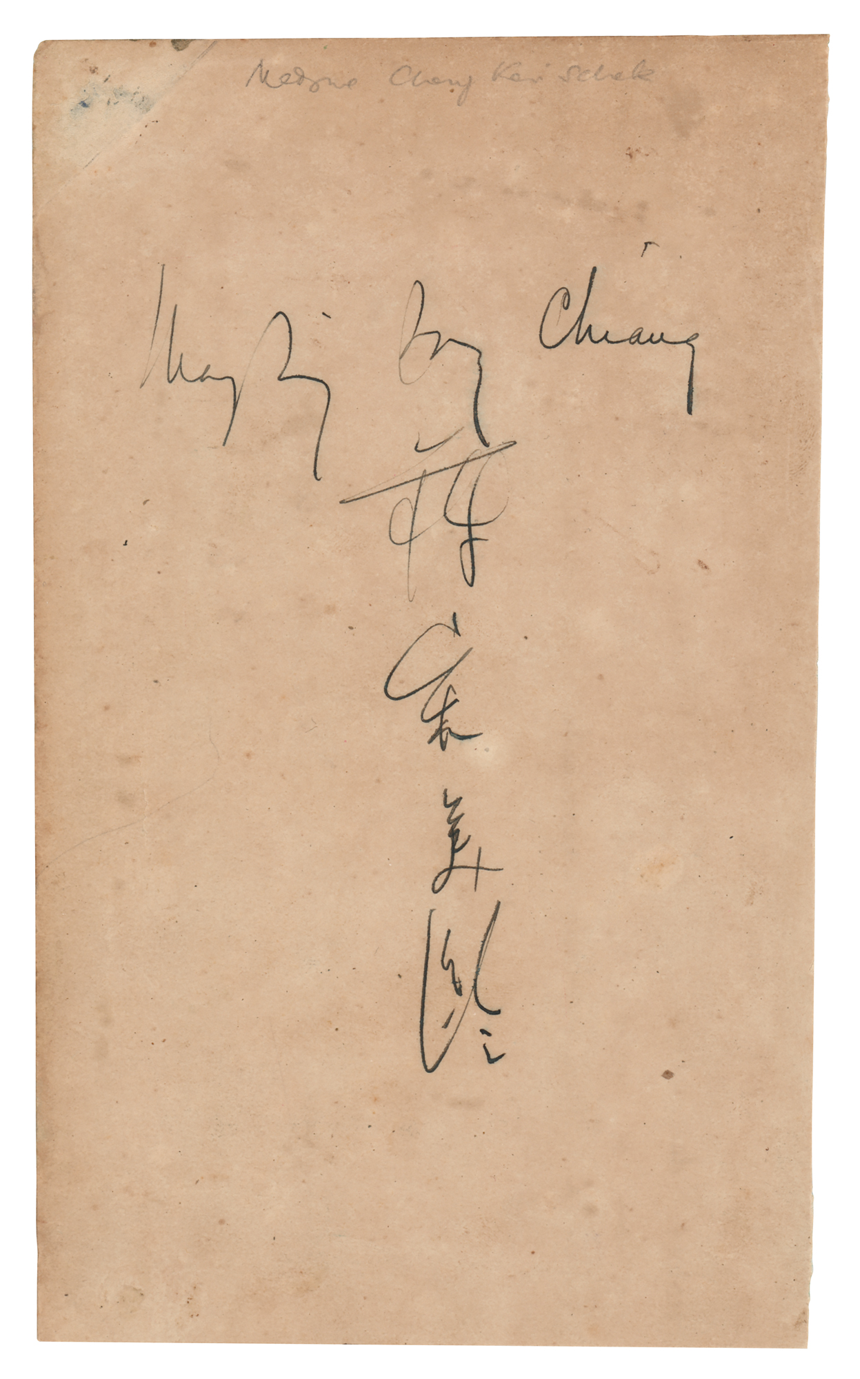 Fountain pen signatures in English and Chinese, "Mayling Soong Chiang,” on an off-white 4.5 x 7.75 album page. In very good to fine condition, with light mottled toning. An uncommon and desirable double signature from Madame Chiang. Accompanied by a full letter of authenticity from PSA/DNA.