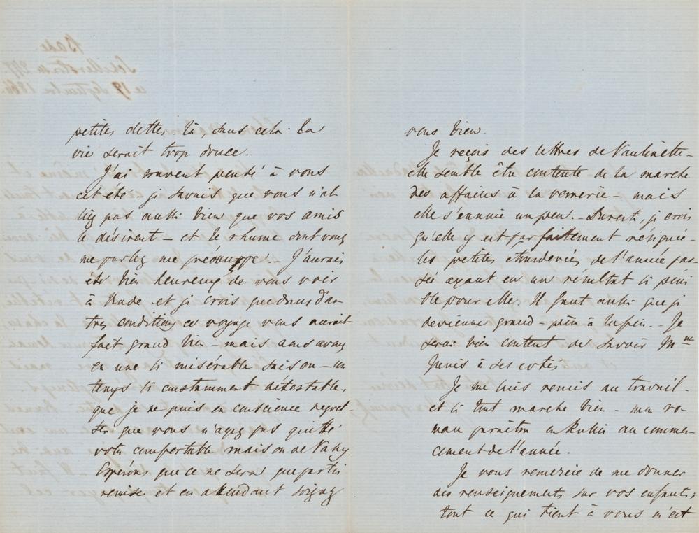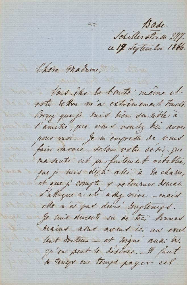 I have often thought of you this summer—I knew that you were not as well as your friends wished—and the cold you mentioned worries me. I would have been so happy to see you in Baden and I think that under different conditions the trip would have been very good for you—but we've had such a miserable season—weather that was so constantly terrible that I cannot in good conscience regret that you did not leave your comfortable home in Passy. Let us hope that this is merely temporary, and take care of yourself in the meantime.