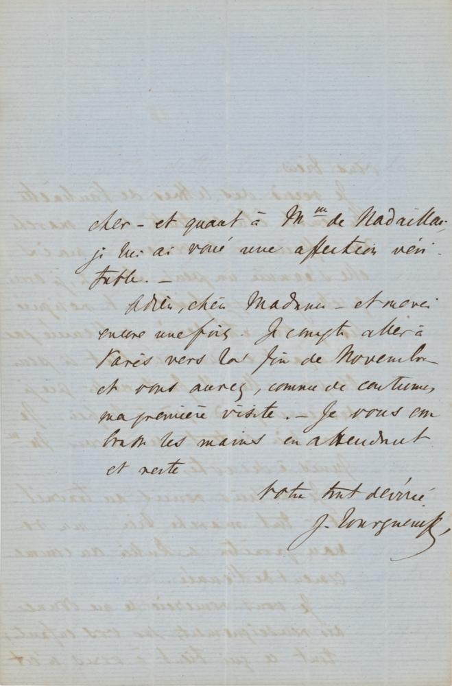 I have returned to work—and there everything is going well. My novel will be published in Russia early next year. Thank you for the news about your children; everything pertaining to you is dear to me—and as for Mrs. Nadaillac, I have sworn a true affection for her. Goodbye, dear Madam—and thank you yet again. I intend to go to Paris in late November and you will be, as always, the first person I call on." In fine condition.