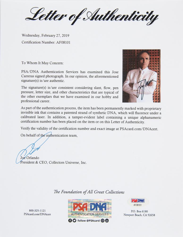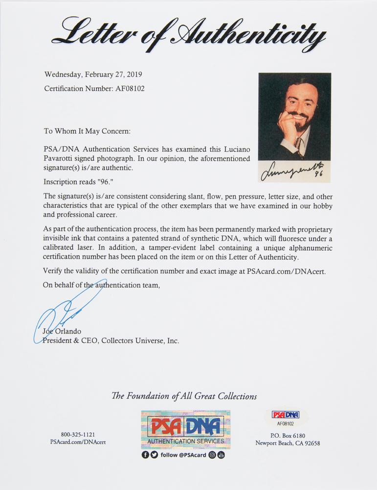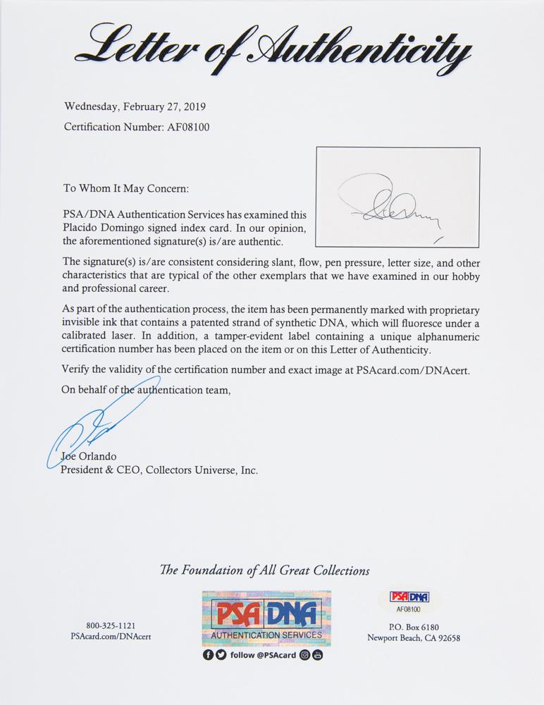 Three items: a color glossy 4 x 6 photo of Luciano Pavarotti, signed in the lower border in black felt tip with date, "96"; a color glossy 5 x 7 half-length photo of José Carreras, signed in black felt tip; and a ballpoint signature of Plácido Domingo on an off-white 5 x 3 card. In overall fine condition. Accompanied by a full letter of authenticity from PSA/DNA for each item.