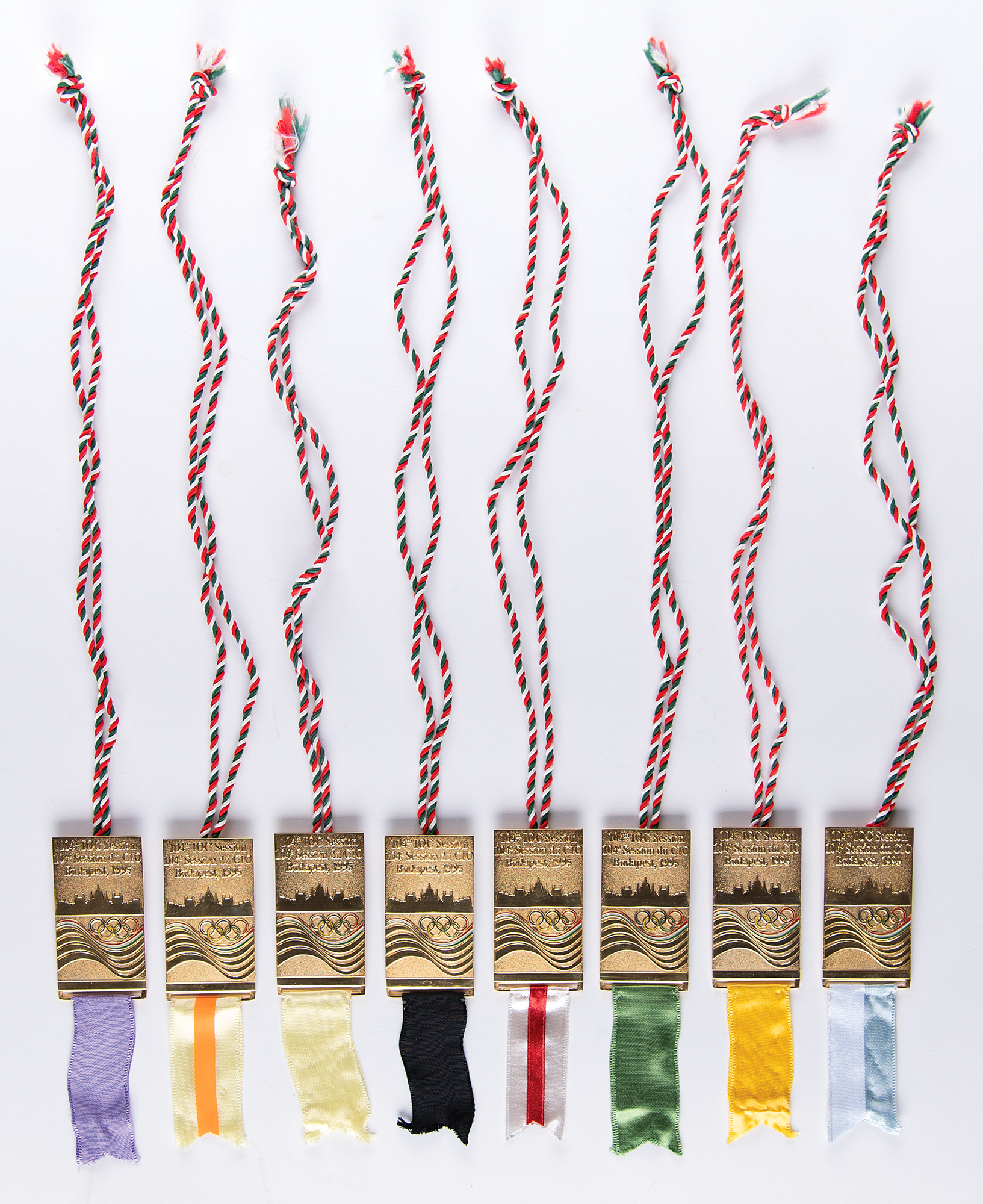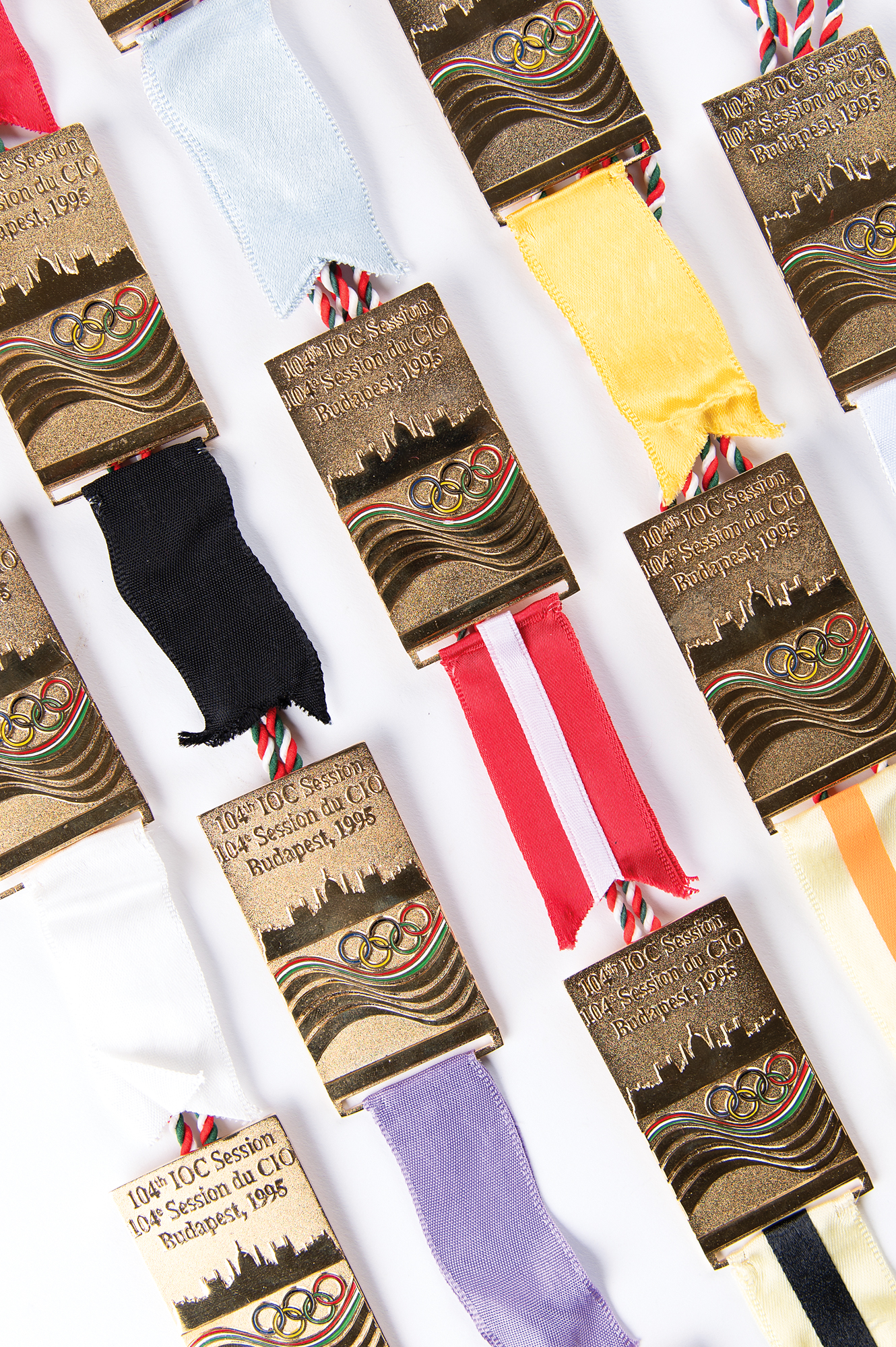 Rare complete set of 16 badges for the 104th International Olympic Committee (IOC) Session in Budapest, Hungary on June 16, 1995, in which Salt Lake City was selected as the host for the 2002 Winter Olympics. Badges measure 1.25 x 2.5 and feature an outline of the Budapest skyline and Olympic rings, with each badge bearing a red, green, and white tassel and a uniquely colored ribbon. An uncommon and attractive assemblage of badges representing the most recent Olympic Games to be held in the United States.