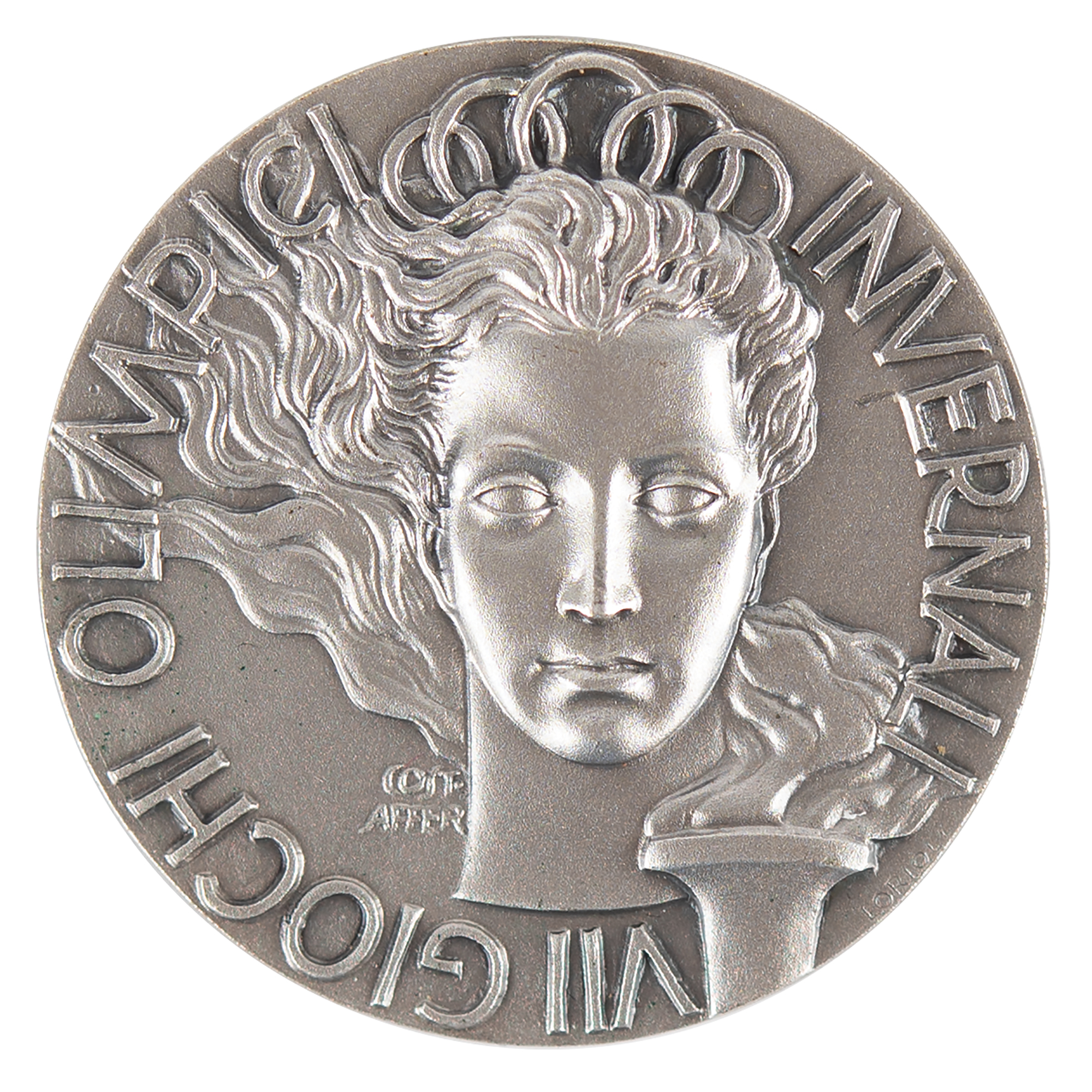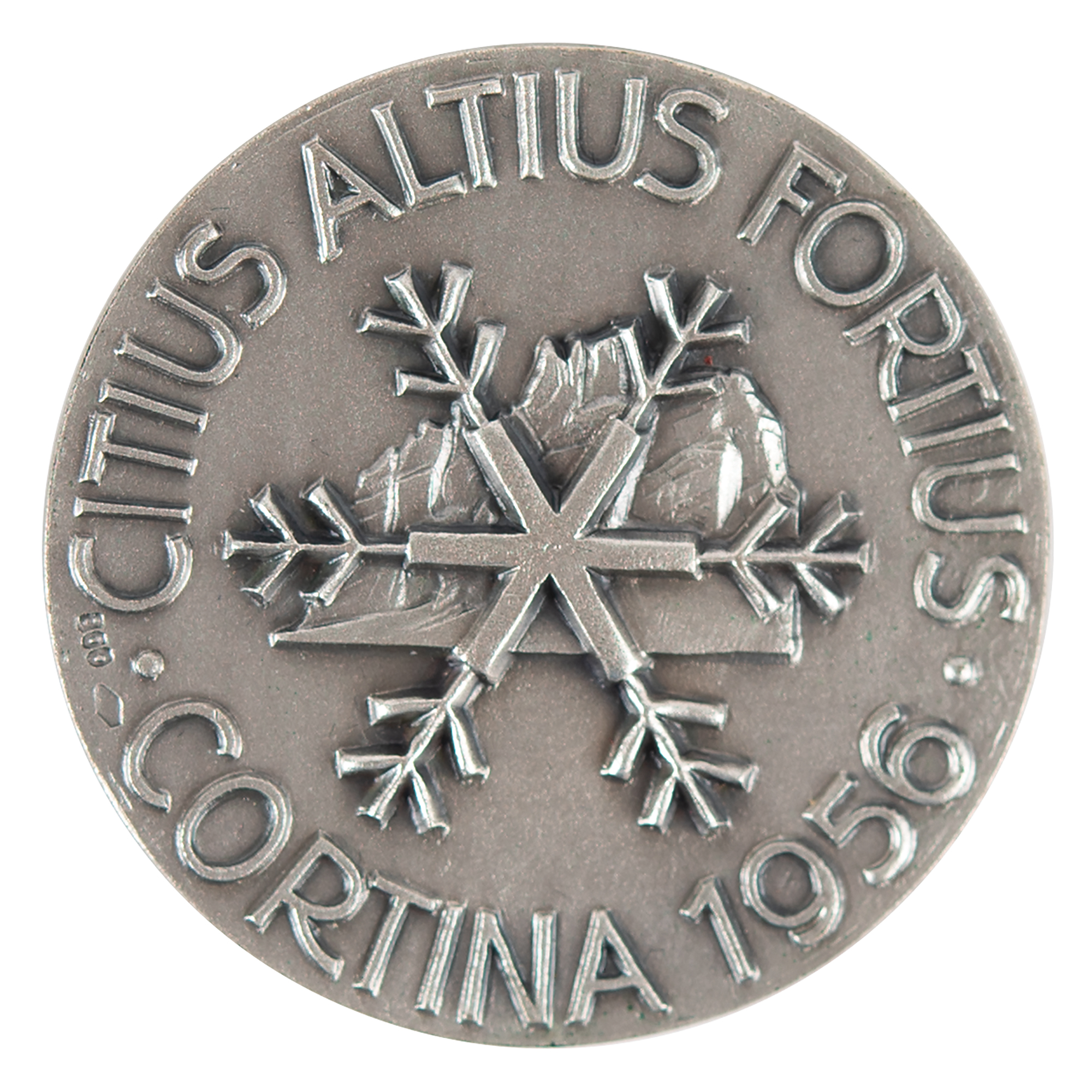 Participation medal issued for the 1956 Cortina Winter Olympics. Silver, 45 mm, 41 gm, by Constantino Affer. The front features the head of Victory crowned with Olympic rings and encircled with raised text, “VII Giochi Olimpici Invernali”; the reverse depicts a snowflake over Mt. Pomagagnon, with raised text, “Citius, Altius, Fortius, Cortina 1956.” An attractive medal with bold designs and a clean presentation.
